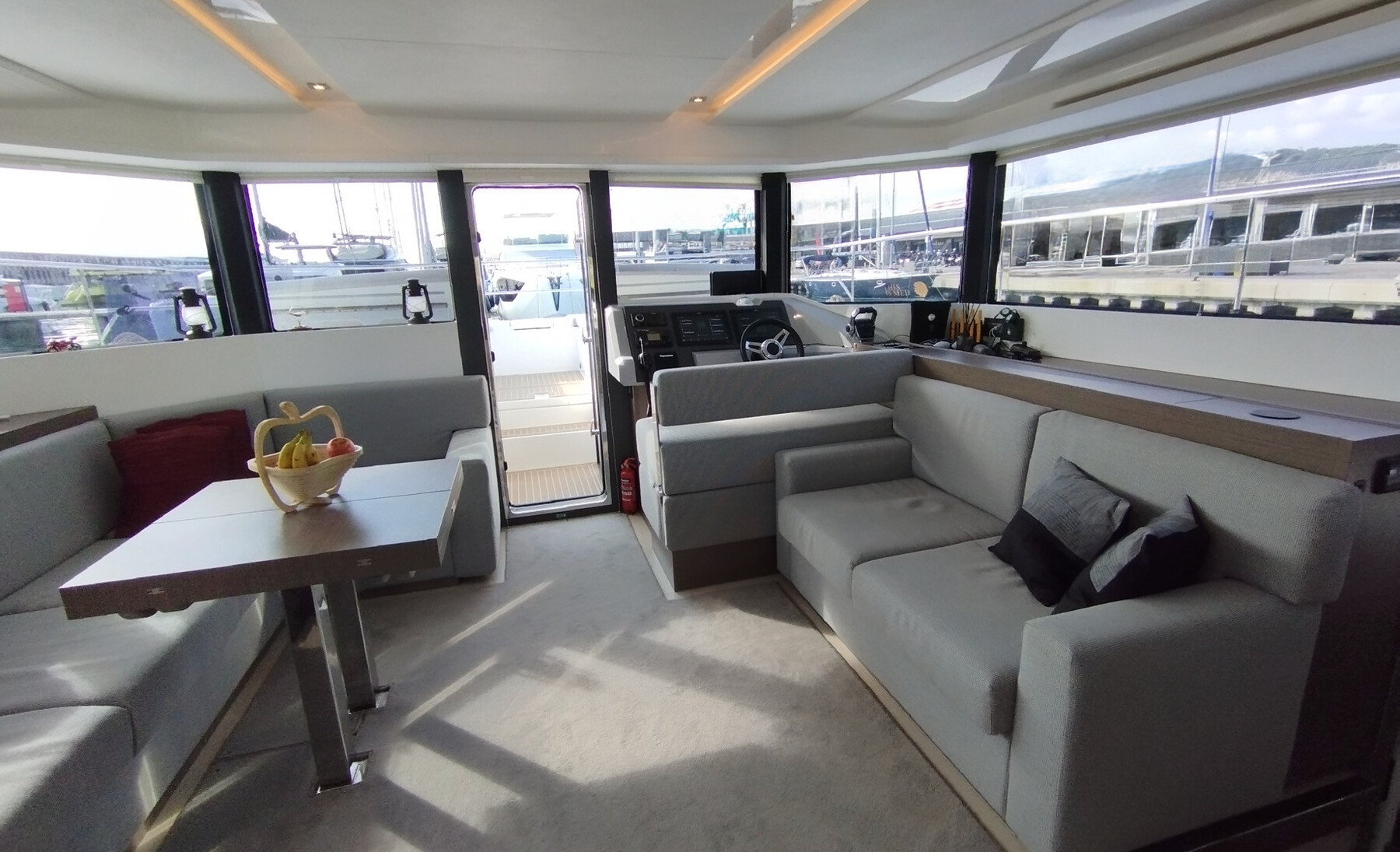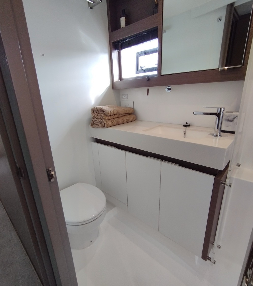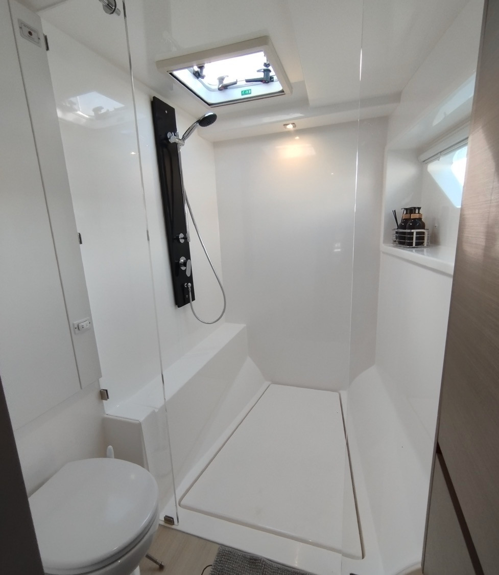 Il dispose de 3 cabines spacieuses avec des lits queen-size et 3 salles de bains équipées de toilettes électriques à chasse d’eau avec eau de mer Le design intérieur se distingue par un ensemble de tissus d’ameublement de haute qualité des tapis dans les cabines et le salon un éclairage LED bleu de courtoisie et des téléviseurs LG Oled dans le salon et les cabines secondaires