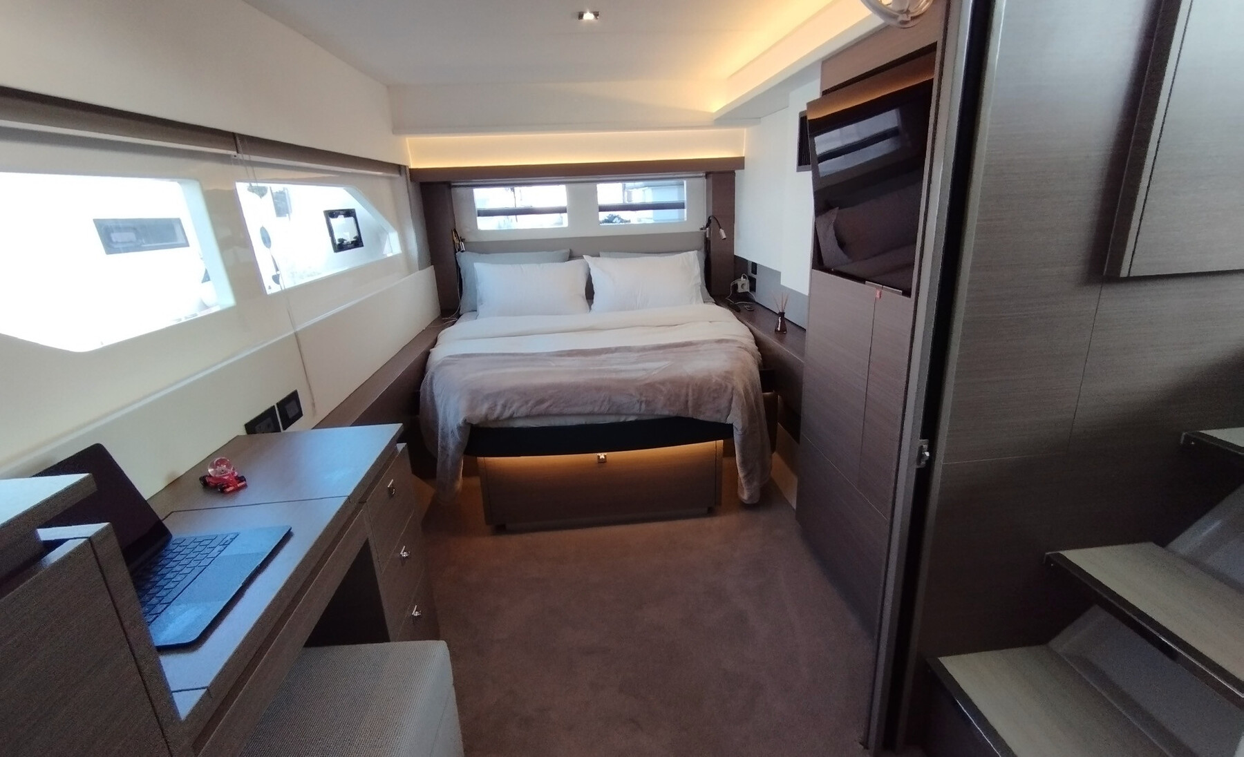 Dispone de 3 cabinas espaciosas con camas tamaño queen y 3 baños con inodoros eléctricos de descarga con agua de mar El diseño interior destaca por un paquete de tapicería de alta calidad alfombras en cabinas y salón iluminación LED azul de cortesía y televisores LG Oled en el salón y las cabinas secundarias