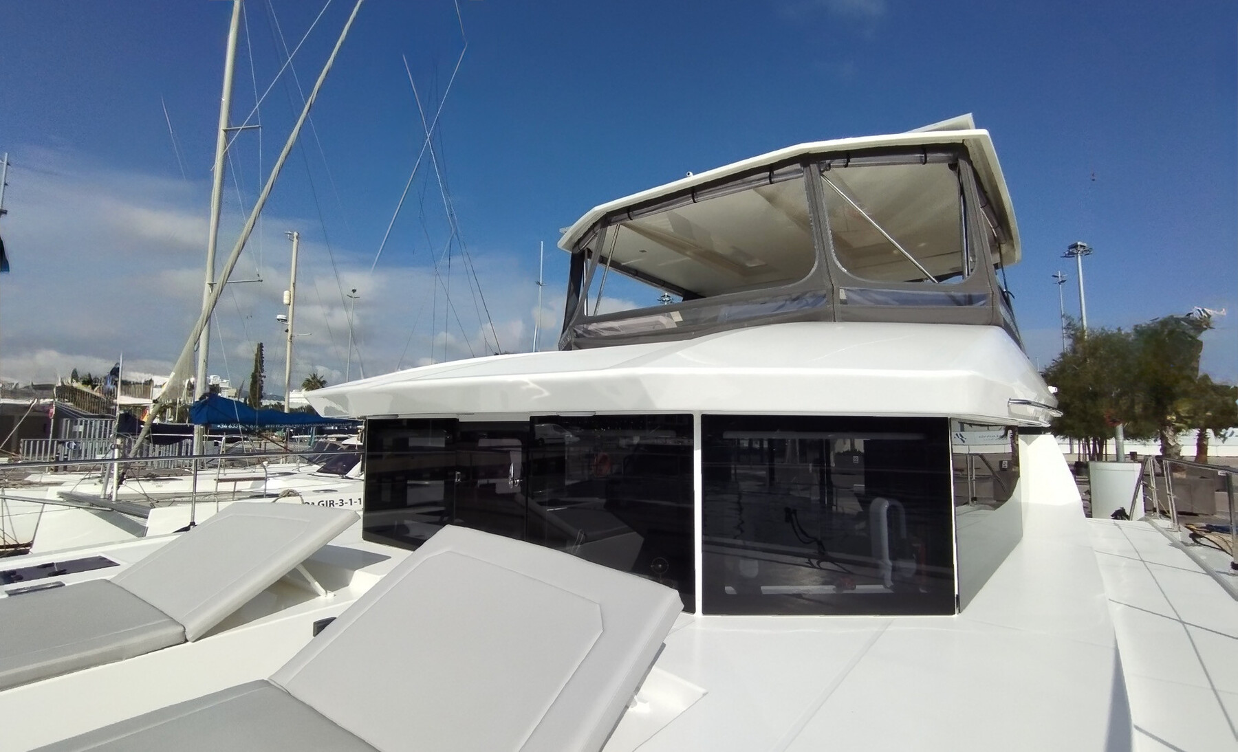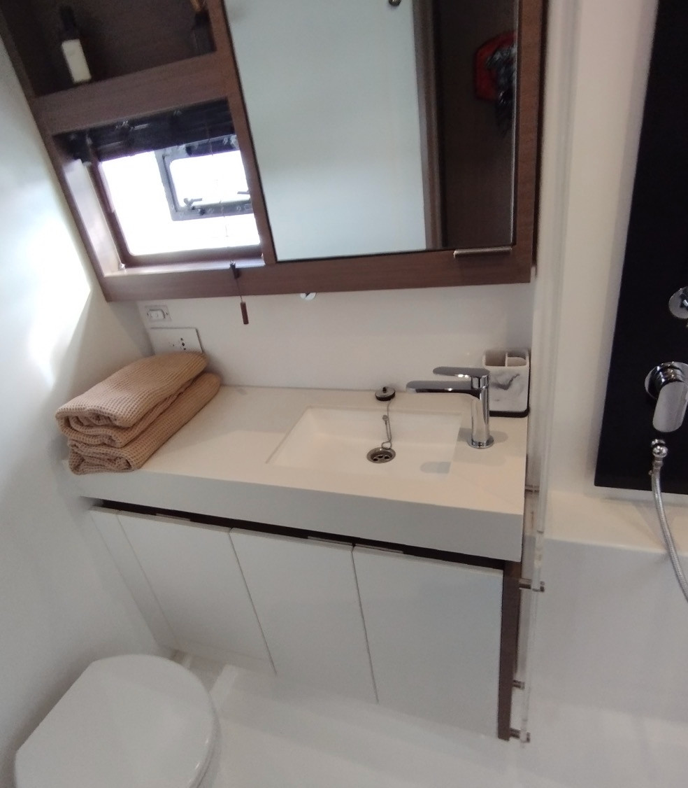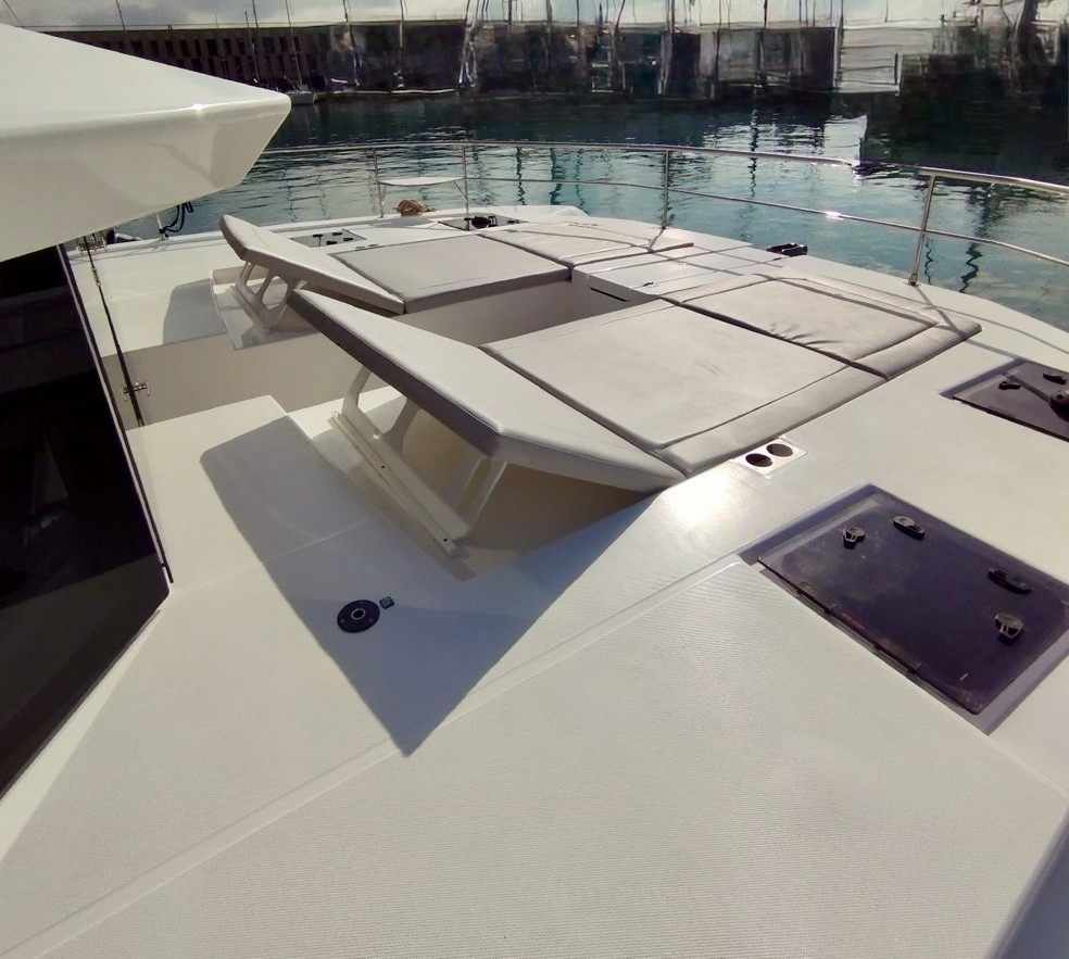 Regarding electricity it features 6 solar panels of 540W with Victron regulators a Fischer Panda silent generator of 10 kVA and Frigomar air conditioning with 70000 BTU/h