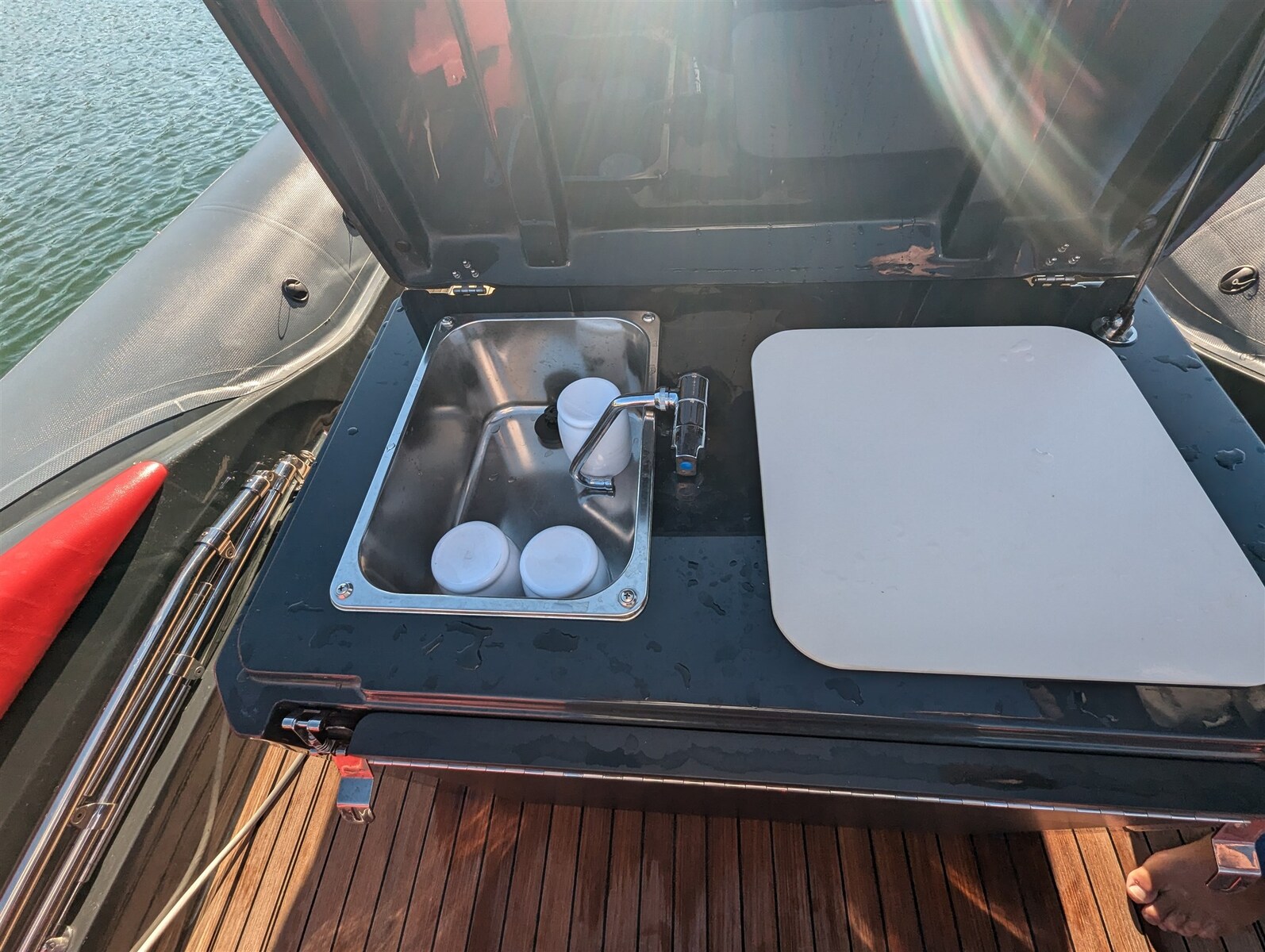 Allarme motore, Ancora (acciaio inox Kg 7,5), Autoclave, 2 Batterie, Camminamenti laterali in teak, Doccia esterna, Luci di cortesia, Piattaforma, Pozzetto Teak, Presa 220V banchina, Salpa Ancore Elettrico, Scaletta da bagno, Tromba.