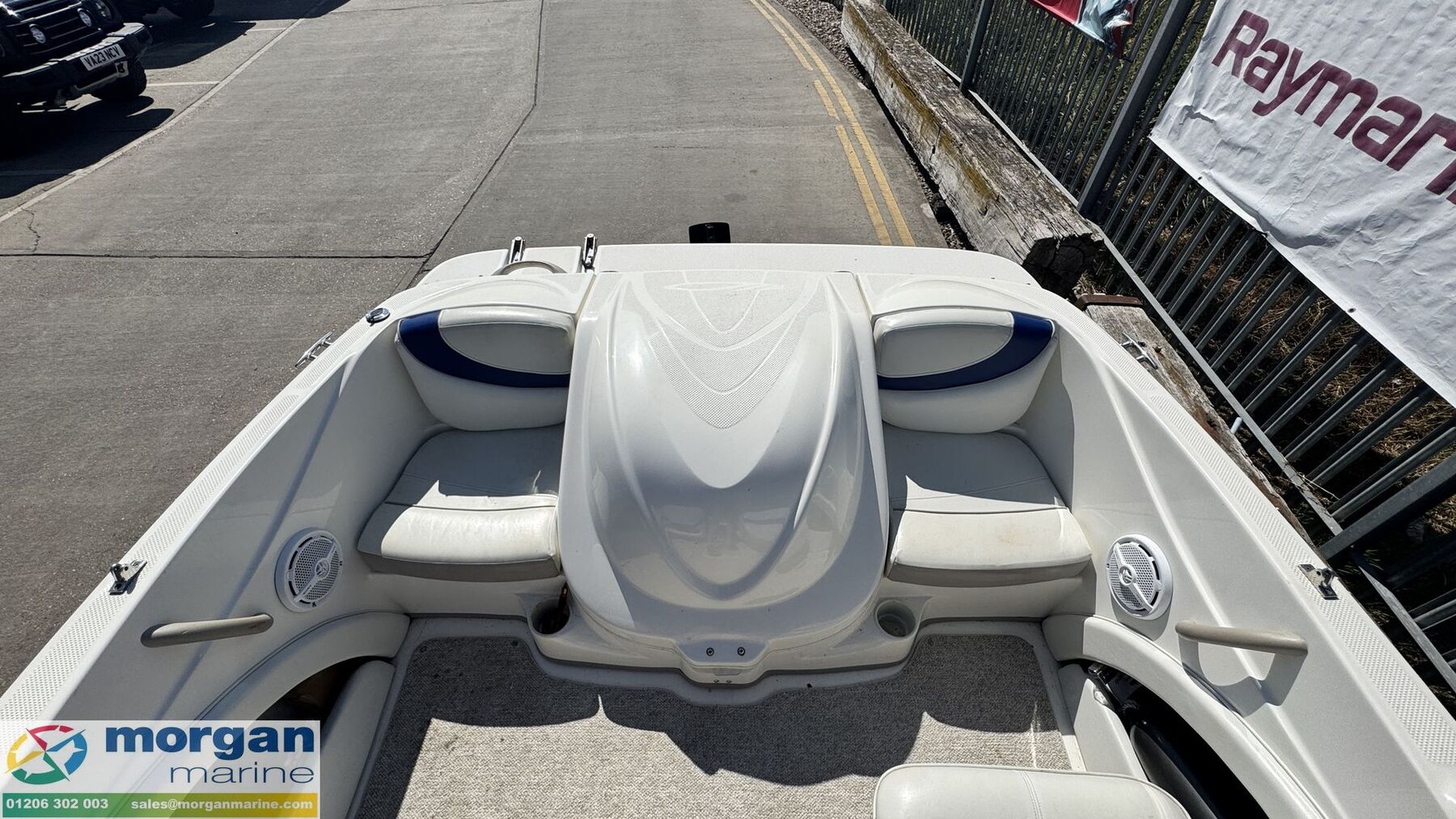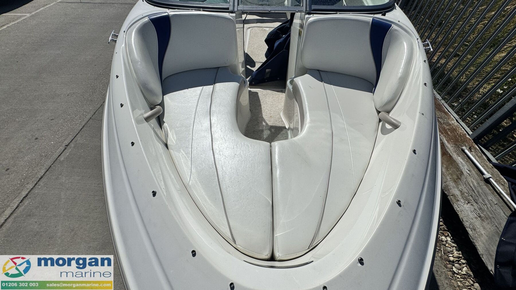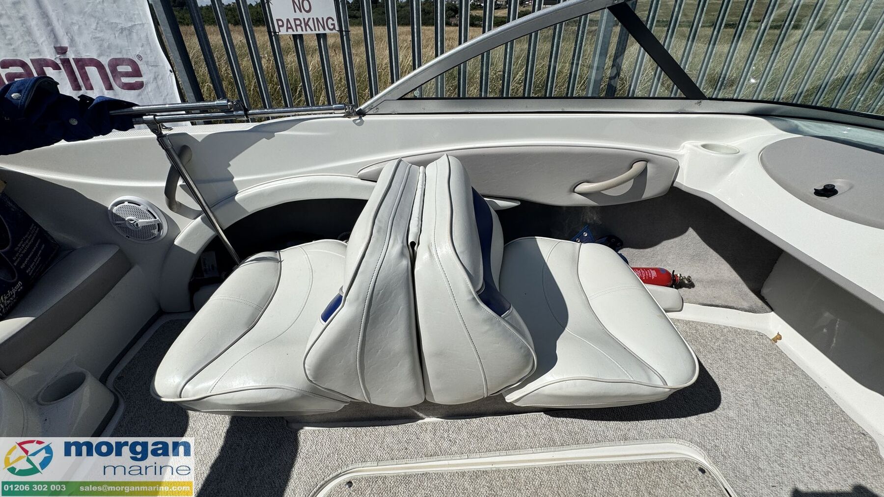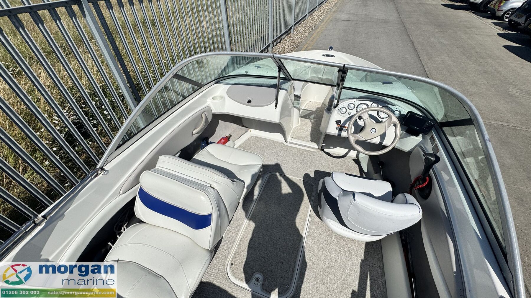 Cockpit: Open bow area with walk-through windscreen with U-shaped seating area. Helm cushioned seating. Co-pilot cushioned back to back jump seat. 2 aft cushioned seats either side of engine box. Cup holders. Deck storage locker. Removable carpets.