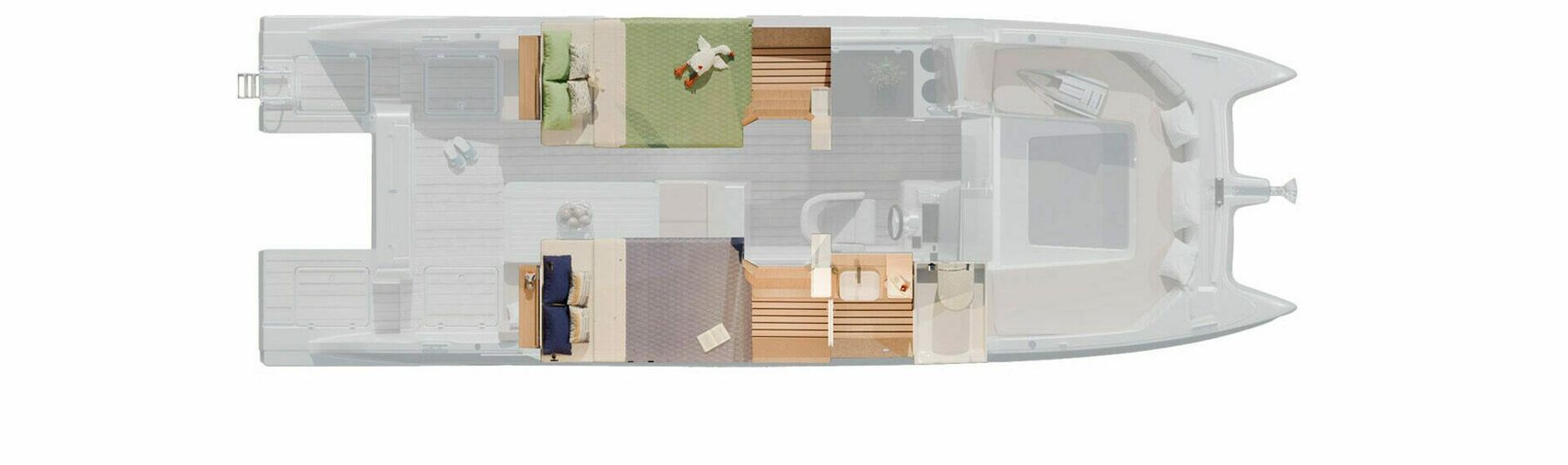 2 cabines doubles avec rangements, hublots et liseuses USB