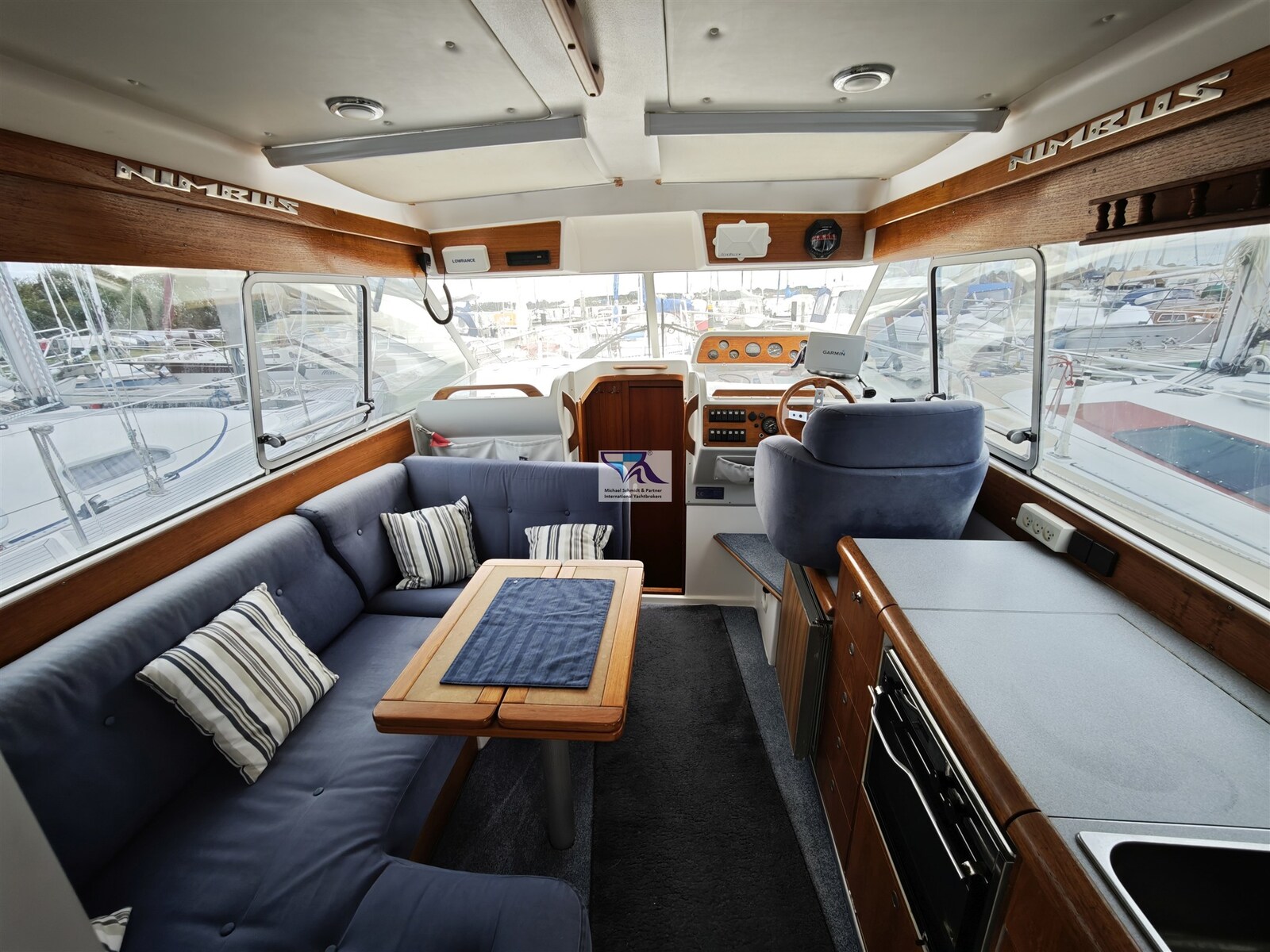 Die Nimbus 310 Coupé hat ein wirklich schönes Layout mit einem großen Cockpit und einer Tür zu der integrierten Badeplattform. Vom Cockpit aus führt eine Schiebetür zum hellen und geräumigen Salon mit einer schönen Sitzecke, Pantry und Steuerstand.
