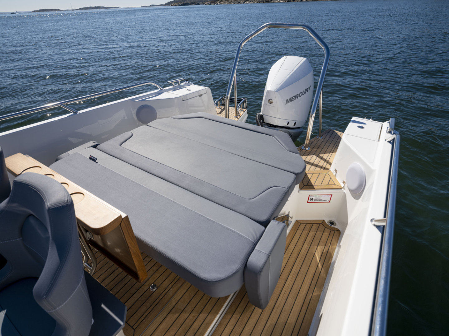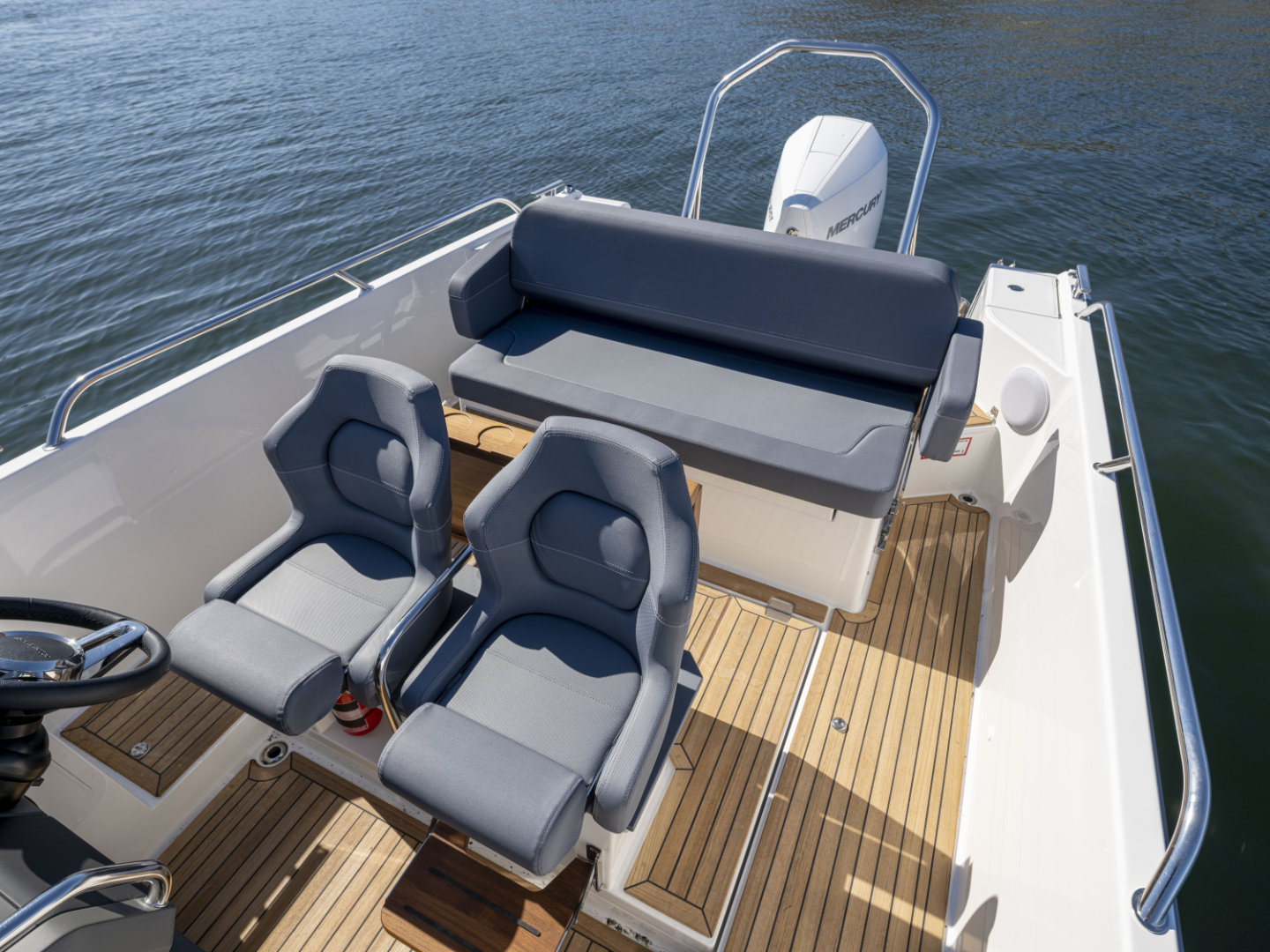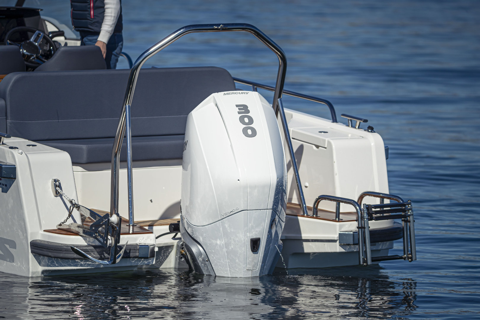 Machinery: Powered by a Cold Fusion White Mercury Verado V8-300 XL with propeller and VesselView 403 display, this boat features Active Trim for optimal performance. Manoeuvrability is enhanced by a Quick bow thruster (#BTQ1253012) and the Zipwake Dynamic Trim Control system with 300mm interceptors. Anchoring is handled by the Quick DP2l 770 bow windlass, complete with a 7.5kg anchor and 25m of 6mm stainless steel chain, controllable from the deck. Comfort and safety come courtesy of an Eberspächer D2 heater with a 20L diesel tank and a black-water overboard discharge system. A bow eye is also fitted for easy trailing. Fuel capacity: 355L. Fresh water capacity: 45L. CE Category C8.