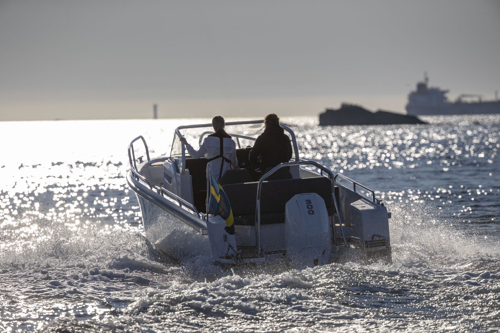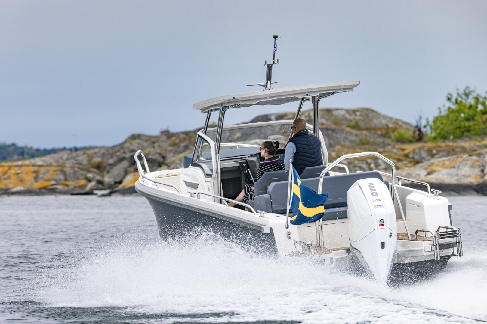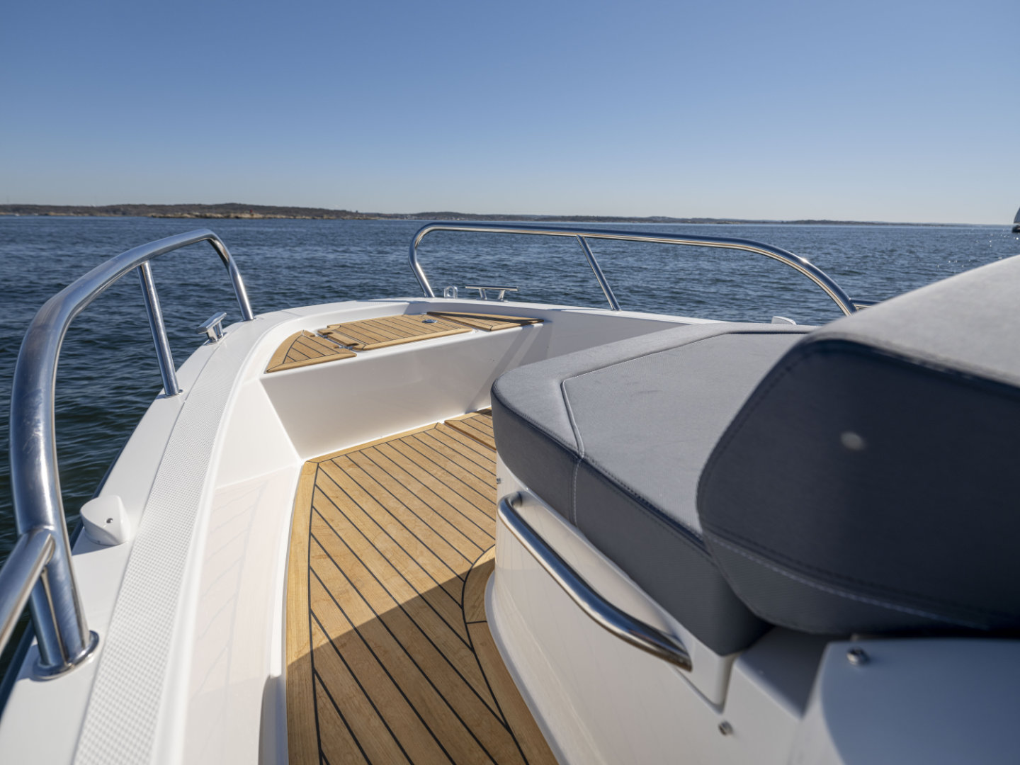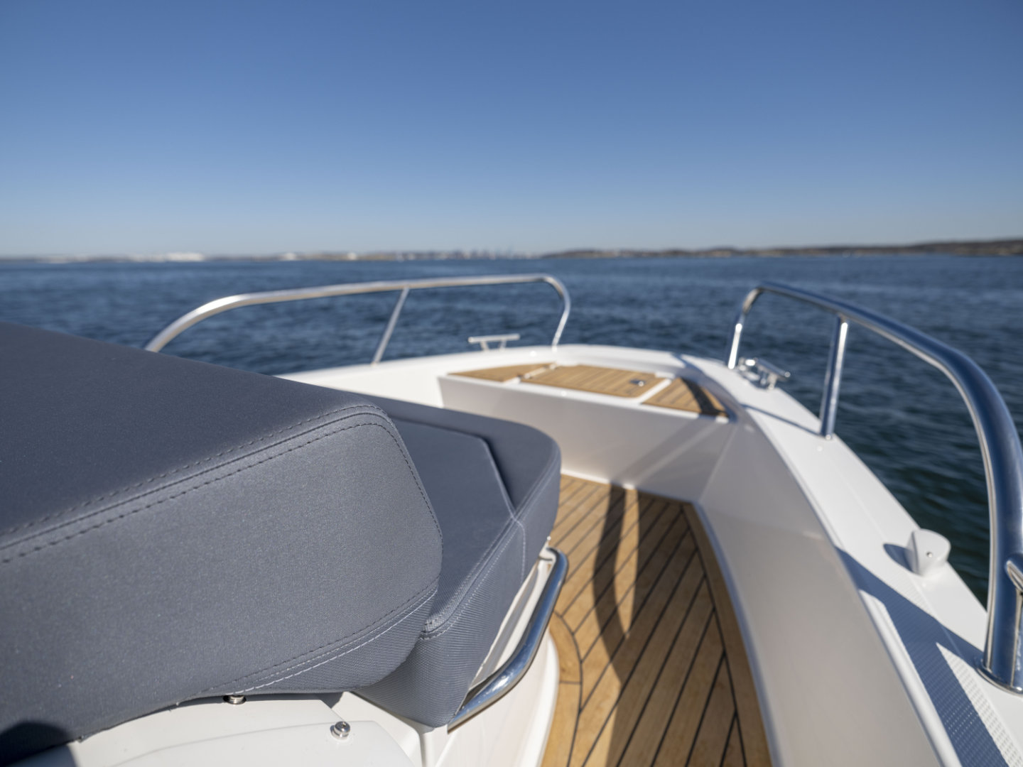 Machinery: Powered by a Cold Fusion White Mercury Verado V8-300 XL with propeller and VesselView 403 display, this boat features Active Trim for optimal performance. Manoeuvrability is enhanced by a Quick bow thruster (#BTQ1253012) and the Zipwake Dynamic Trim Control system with 300mm interceptors. Anchoring is handled by the Quick DP2l 770 bow windlass, complete with a 7.5kg anchor and 25m of 6mm stainless steel chain, controllable from the deck. Comfort and safety come courtesy of an Eberspächer D2 heater with a 20L diesel tank and a black-water overboard discharge system. A bow eye is also fitted for easy trailing. Fuel capacity: 355L. Fresh water capacity: 45L. CE Category C8.