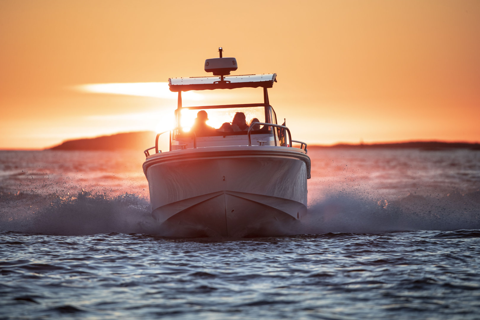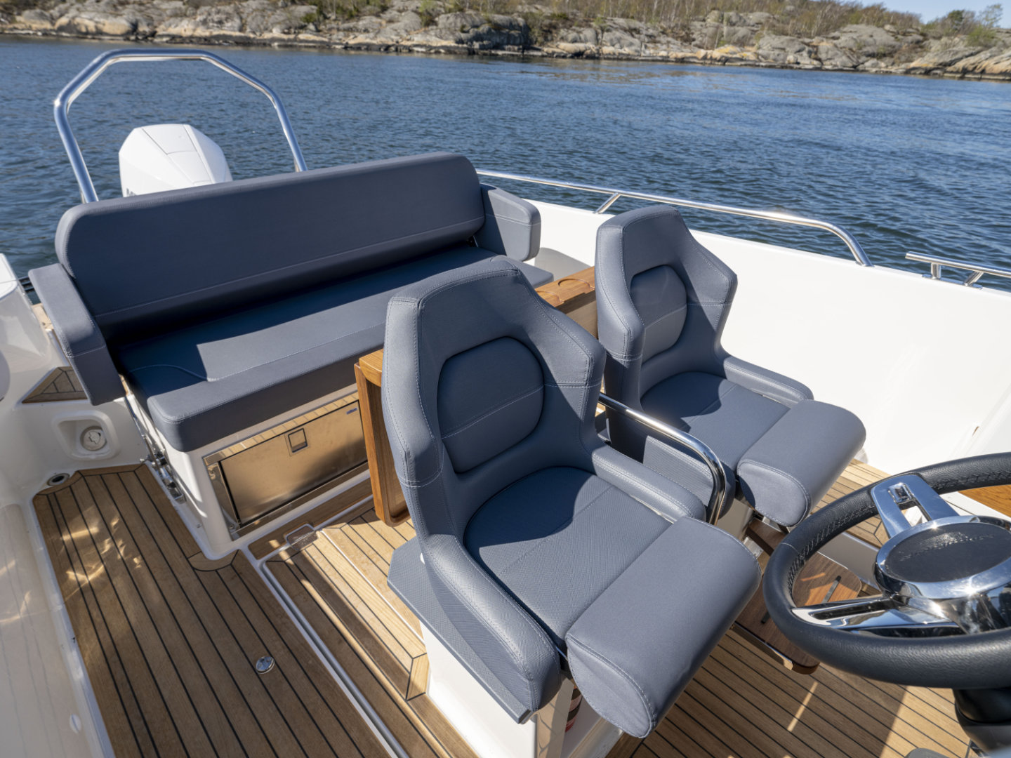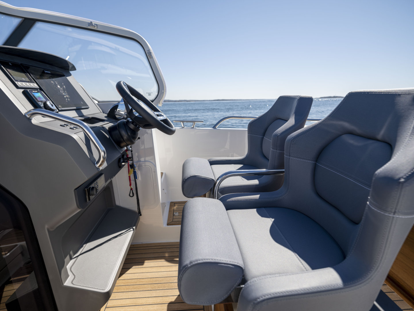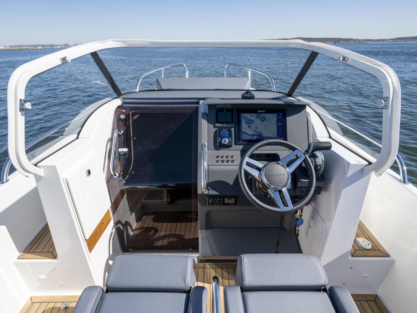 Cockpit: The helm is equipped with a Simrad NSX 12” multifunction plotter, paired with a Simrad xSonic SS60 sonar featuring a thru-hull transducer, providing clear navigation and detailed underwater imaging for confident handling.