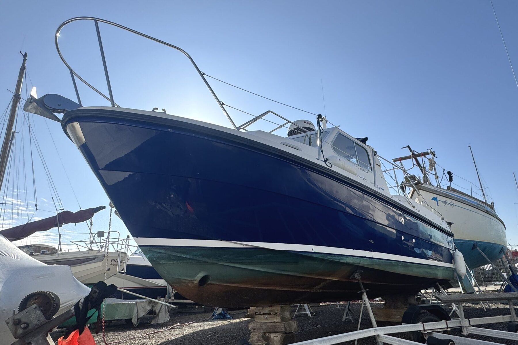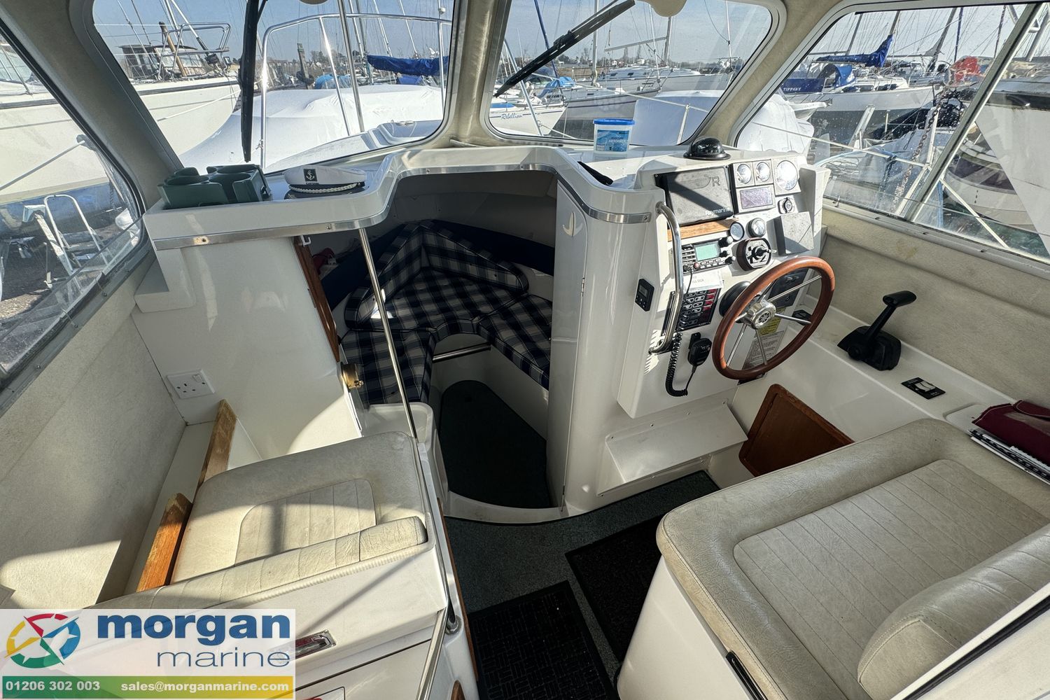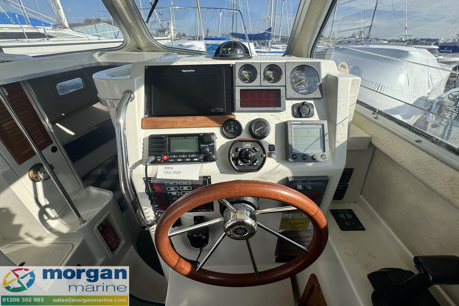 Electronics: Raymarine chart plotter. Raymarine Radar. Standard Horizon VHF radio. 12v USB socket. Raytheon Tridata display. Electric trim tabs. Bow thruster. Electric windscreen wipers. Compass. Nav lights. Interior lights. Anchor light. Cabin lights. Roof searchlight. Automatic and manual bilge pump. Engine gauges ( Oil pressure, temperature, Yanmar engine RPM, fuel and trim). Shore power connection with 2x connections on deck.