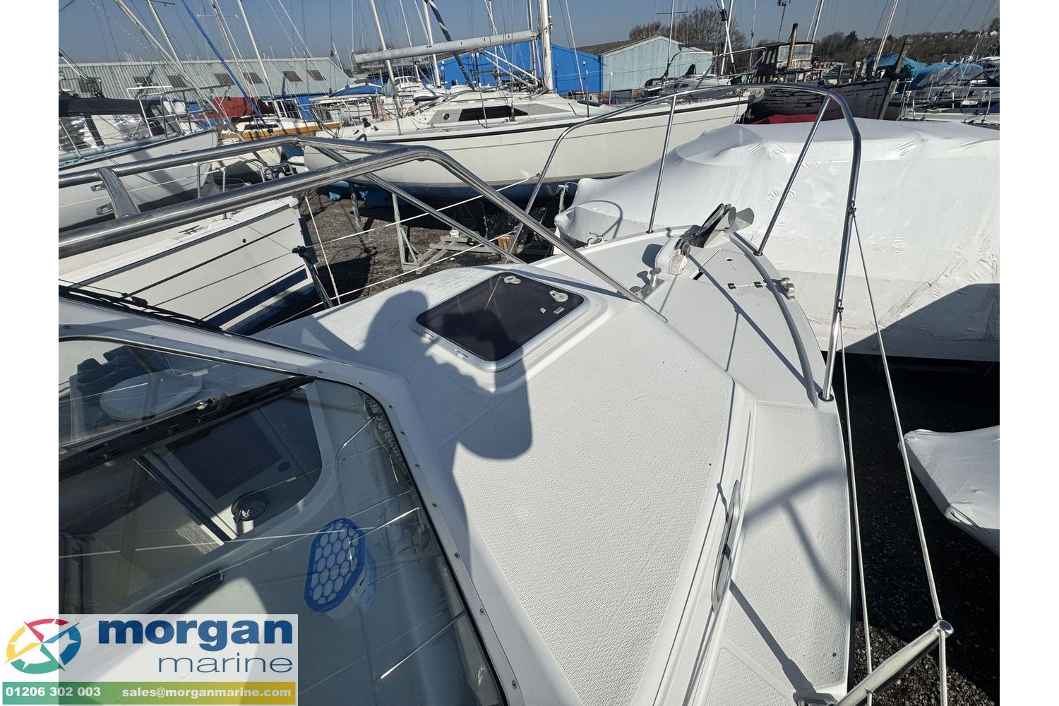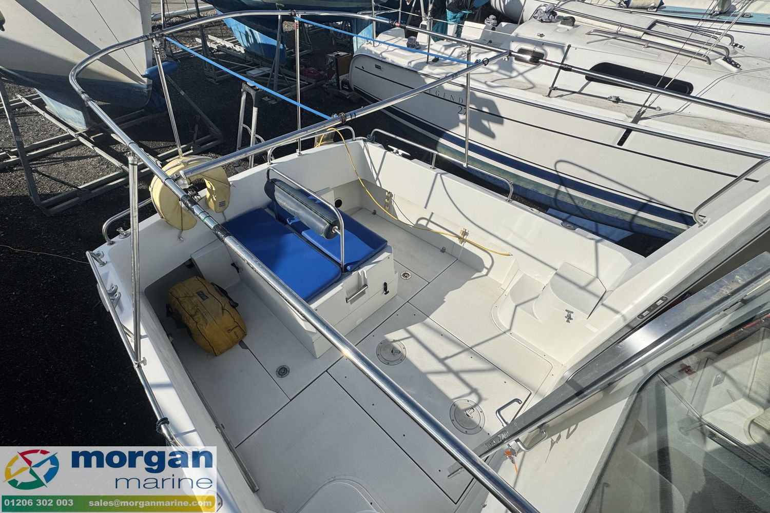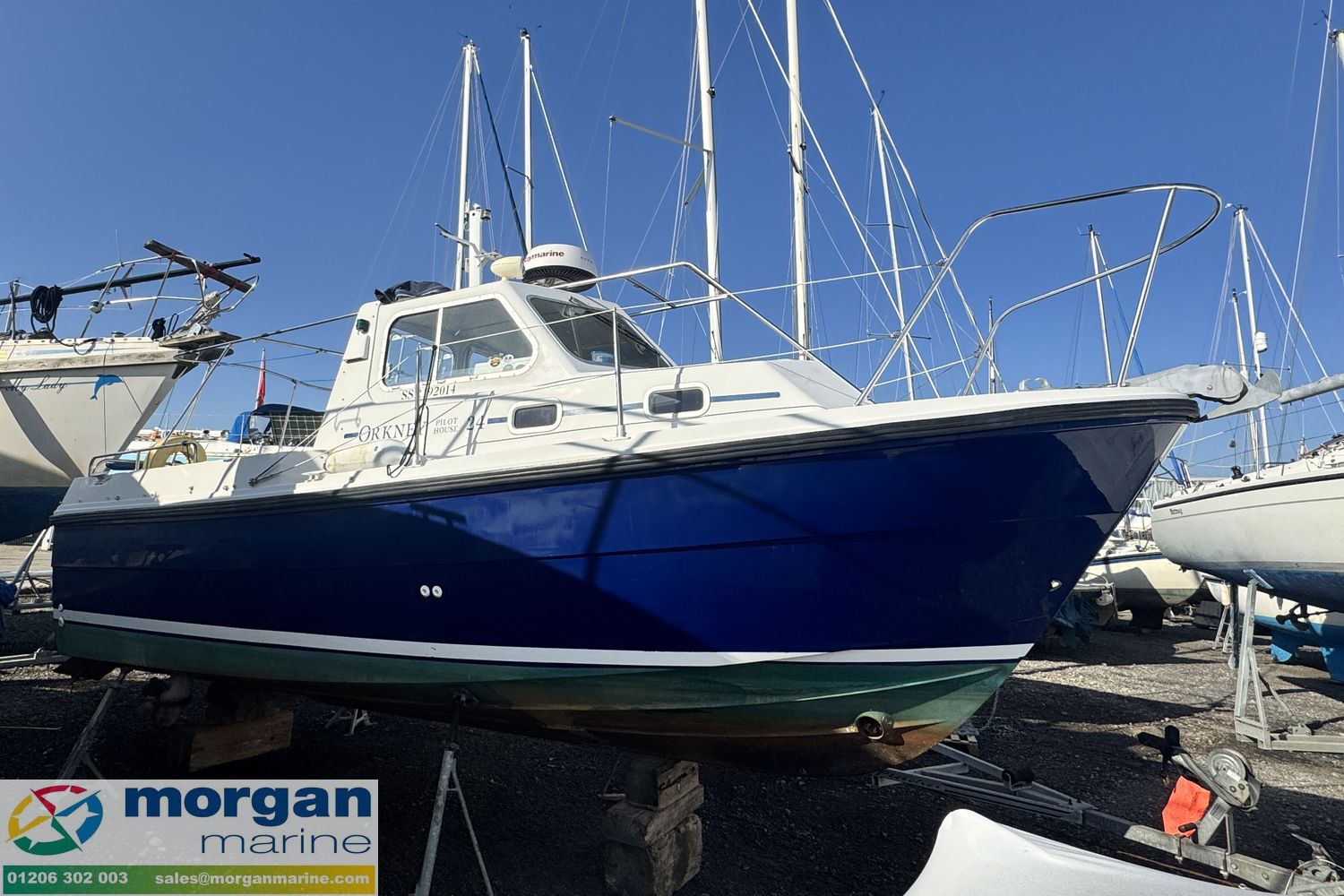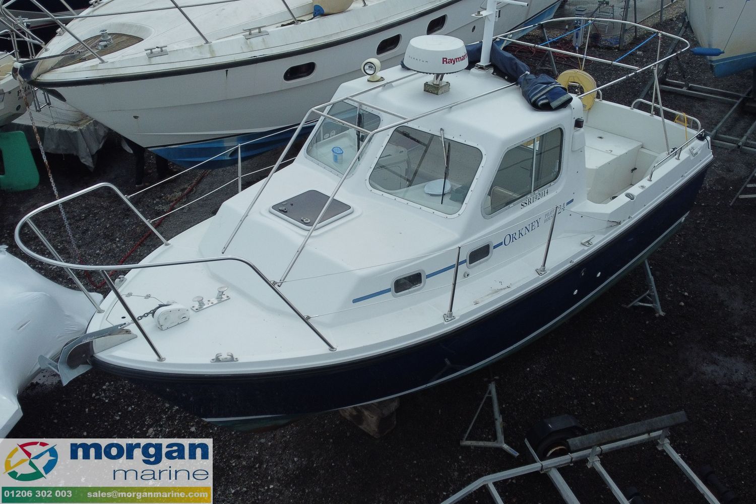 This stunning Orkney Day Angler 24 just arrived at Morgan Marine, is perfect for both fishing trips and outings with family and friends. It features a spacious open cockpit, a large wheelhouse, a roomy V-berth, and a generous aft deck with ample seating, making it ideal for fishing. The boat is equipped with a range of electronics, including a Raymarine chart plotter, Raymarine Radar, Standard Horizon VHF radio, electric windlass, trim tabs, bow thruster, and much more! High pedigree of boat with excellent sea keeping qualities. Powered by an Yanmar 190 diesel inboard engine with a very good service history. Call now for viewing as this boat wont be around for long!