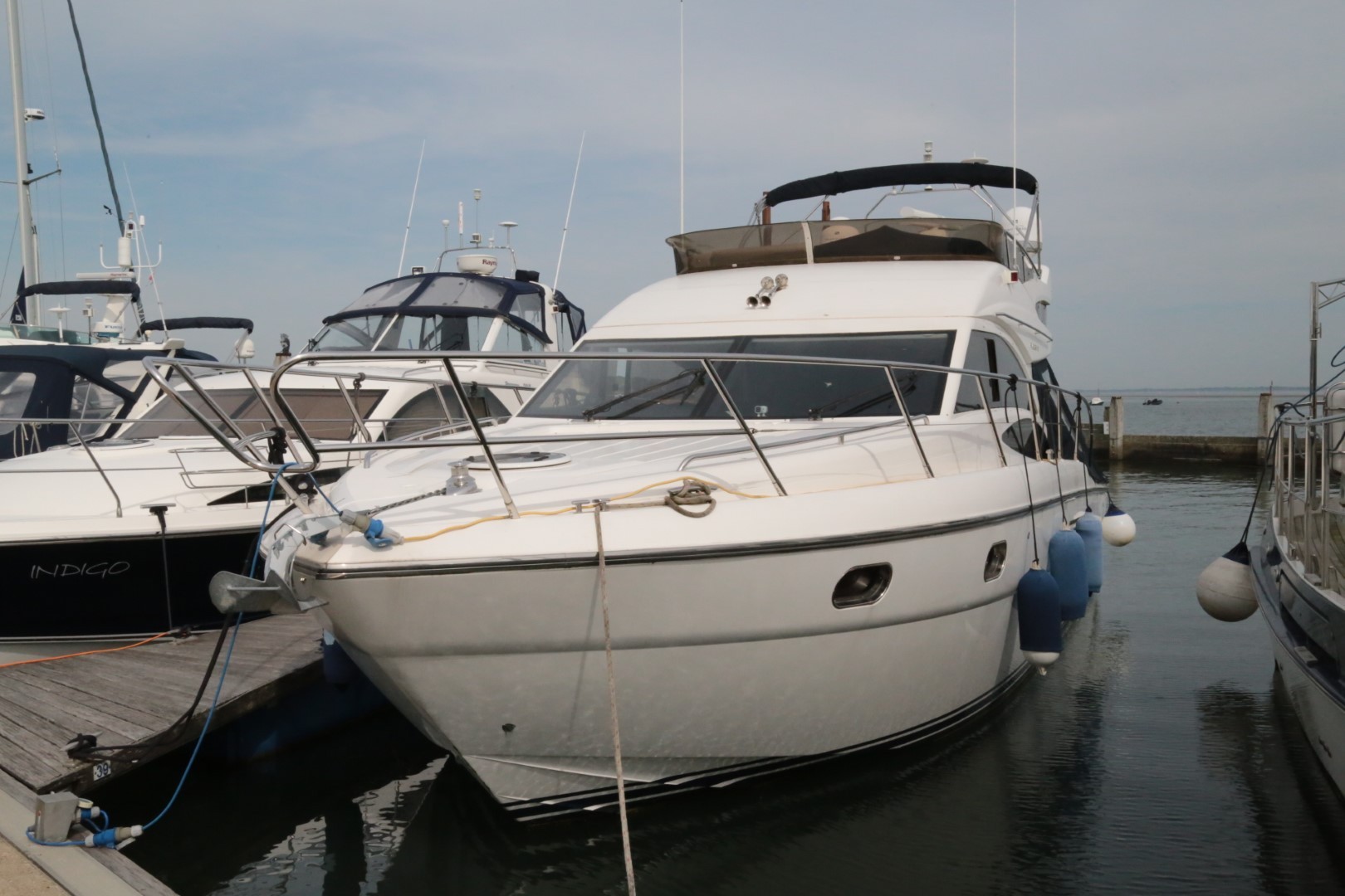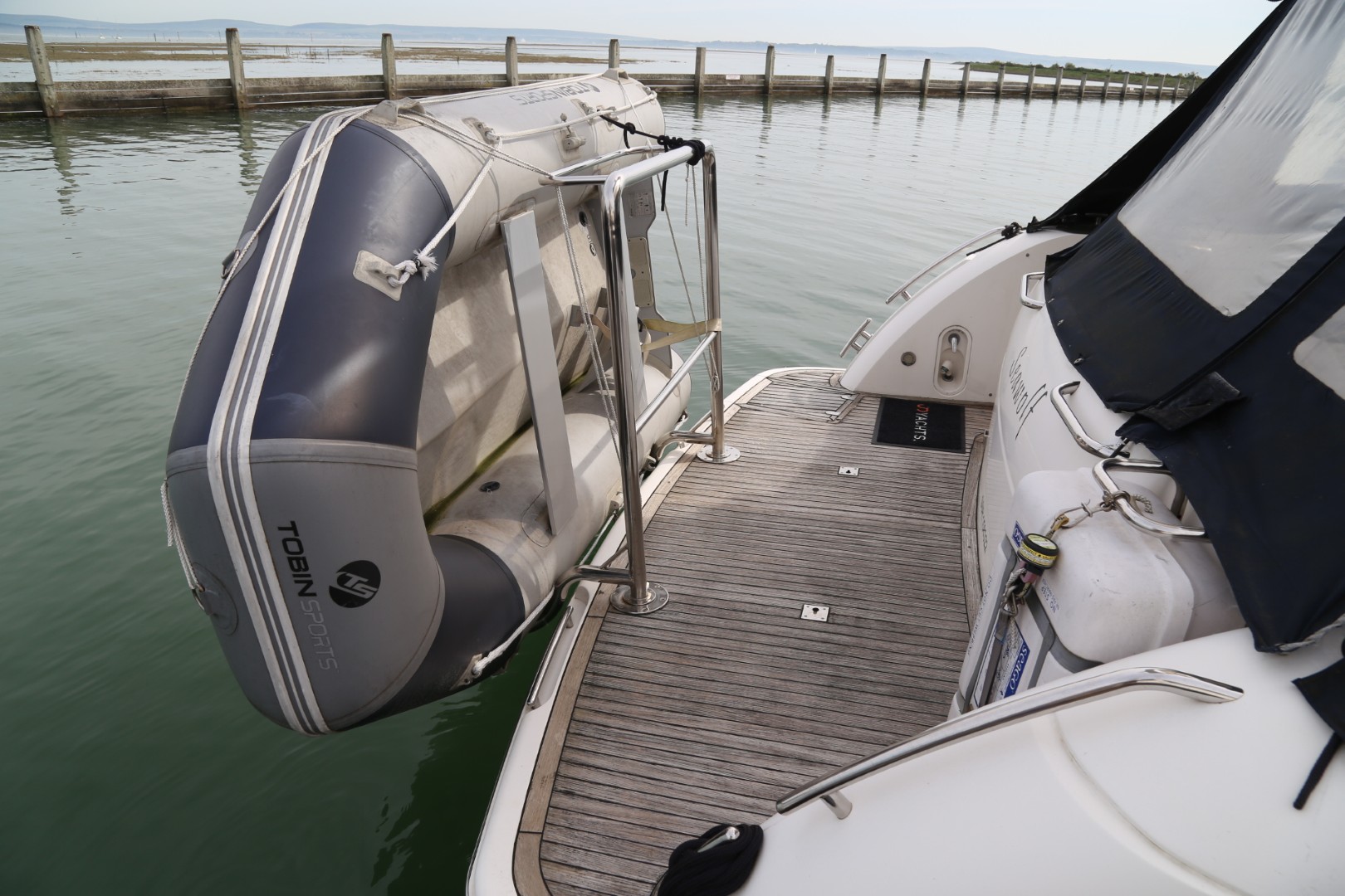 Full-length transom bathing platform with foldaway swimming ladder, hot and cold shower, teak decking, storage compartment and dinghy storage removable chock system