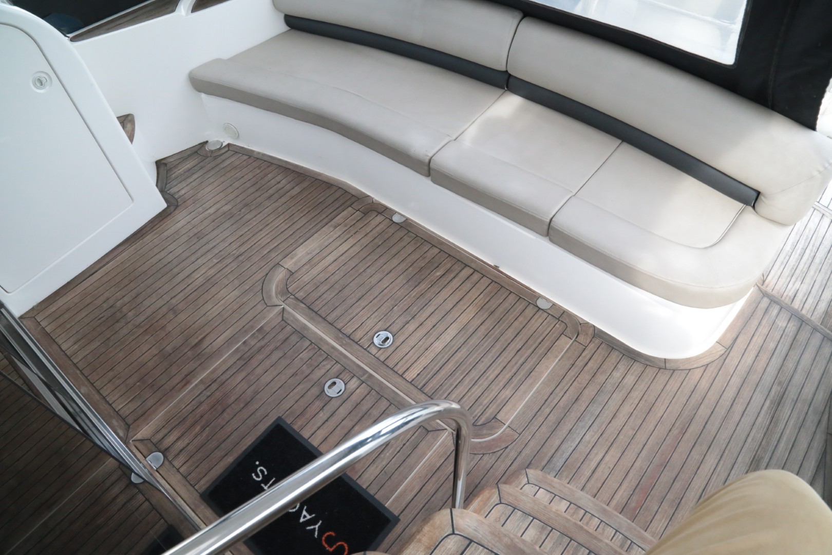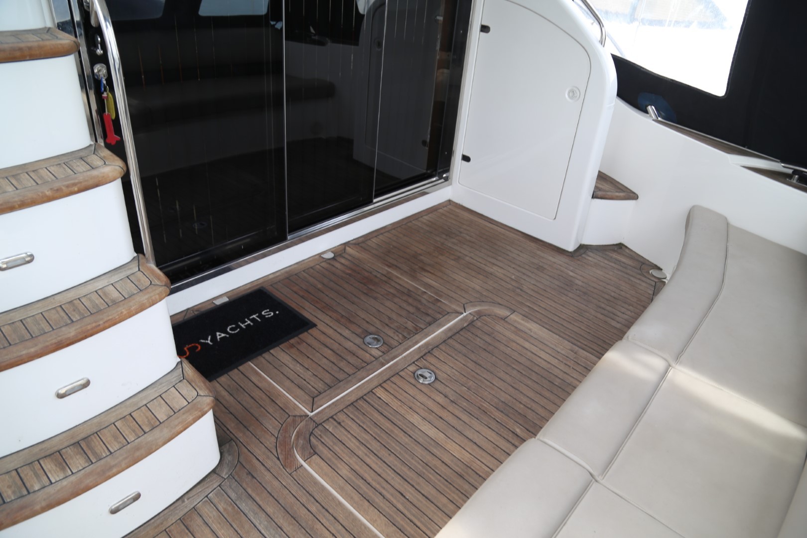 Teak-laid transom platform, cockpit deck, flybridge stairway and stairs to side decks