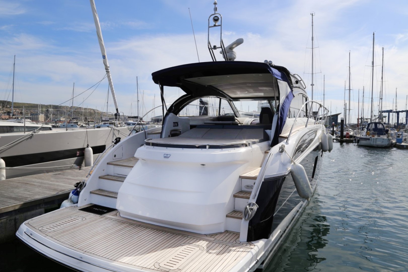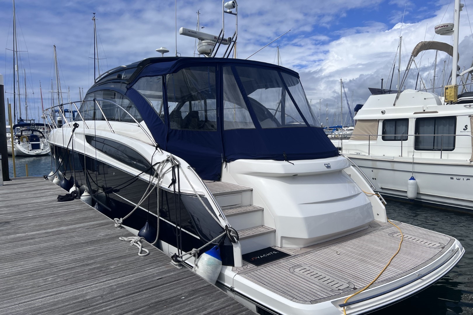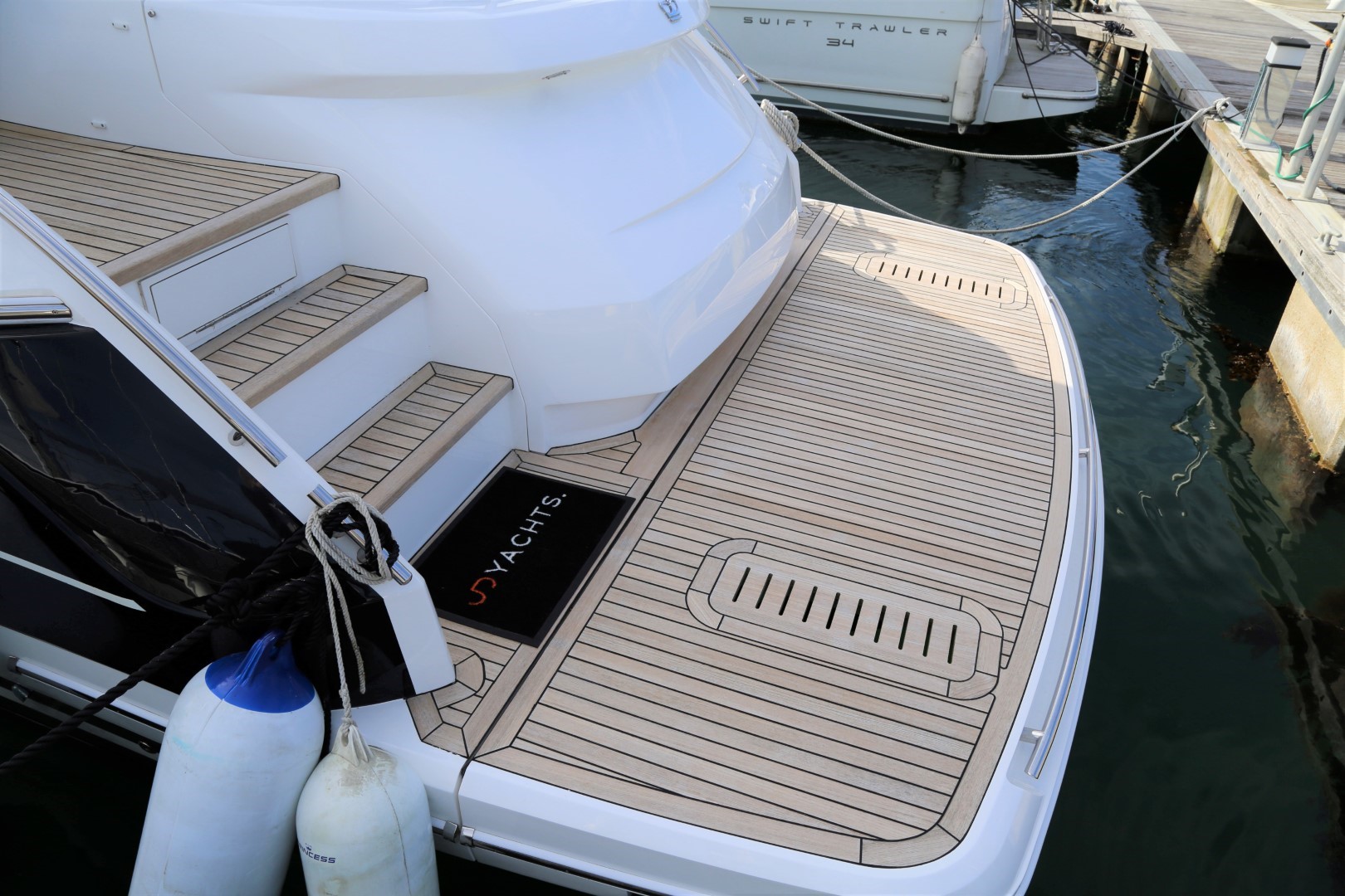 Teak-laid transom platform/cockpit deck/stairs to side decks