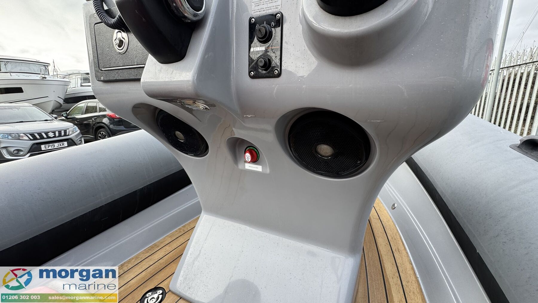 Electronics: Raymarine chart plotter. Garmin VHF radio. Fusion audio system with speakers. Yamaha digital engine display. Navigation lights. Anchor light. LED deck lights. Compass. Automatic and manual bilge pump. Isolator switch. Switch panel on dash.