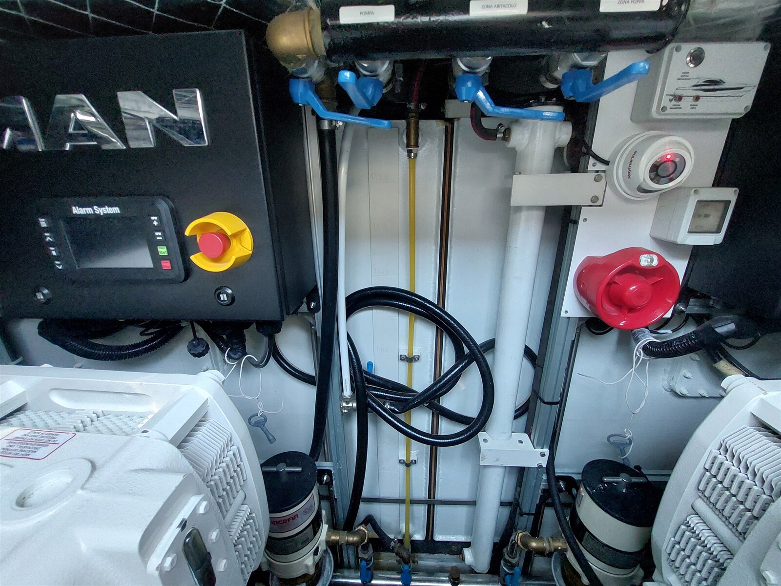 Fume/Gas Detector, 2 Engine Alarm, Bilge Alarm, Alternator, Water pressure pump, Batteries (New 2025), Teak Side Decks, Battery charger (Victrom), Shore power cable, Guard rail, Deck Shower, Directional Spotlight, 2 Hydraulic Flaps, Hard top, 2 Flaps Indicators, Anchor Chain Washdown, Washbasin in the cockpit, Courtesy Lights, Underwater lights, Outboard engine for tender, 6 Fenders, Gangway (Opacmare eletroidraulica a scomparsa), Platform, Waste Water Tank Drain Pump, 4 Automatic Bilge Pump, Teak deck, Entry door, Teak Cockpit, Shorepower connector, Water harbor connector system, Electric Windlass, swimming ladder, cockpit table, Tender (2.20), Horn, T-Top, Stern Winches, Bow Winches.