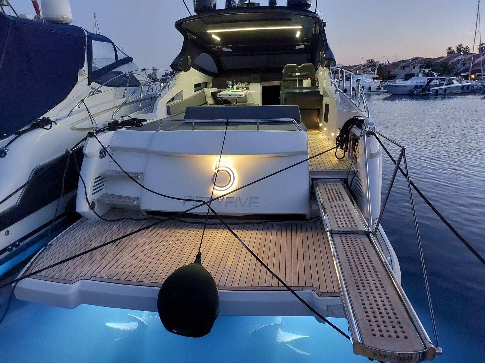 Der neue INfive sucht seinesgleichen. Der schnellste in seiner Kategorie mit maximal 45 Knoten. 3 Kabinen + Matrose oder Garage in 16 Metern. Für alle, die raus wollen. IN five ist mit dem 800 PS starken MAN i6 ausgestattet und der Antrieb wird durch Top-System-Oberflächengetriebe garantiert, die der Yacht mit Unterstützung des "Easy-Trim"-Systems nicht nur hervorragende Leistungen, sondern auch Gleiten bei niedrigen Geschwindigkeiten garantieren. Die Manövrierfähigkeit wird dem Joystick am Steuerstand anvertraut. Fiftyfive fügt Bugstrahlruder und Heckstrahlruder für maximales Handling hinzu, selbst wenn es unter kritischen Bedingungen vertäut ist. Wie neu und bereit für jeden Test wartet diese Sportyacht der neuesten Generation nur darauf, dass ein neuer Eigner weitere aufregende Saisons erlebt. Möglichkeit, den laufenden Mietvertrag zu übernehmen.