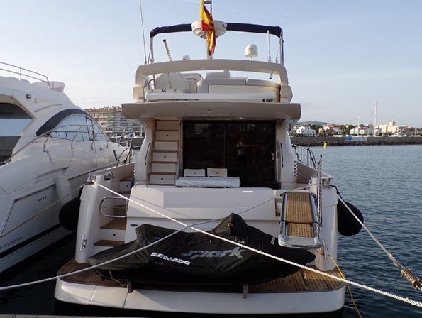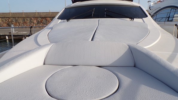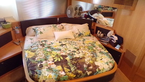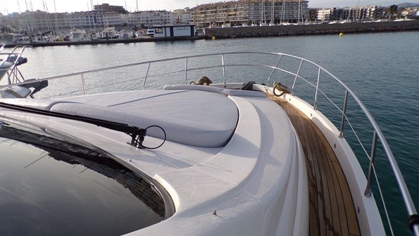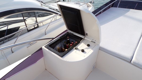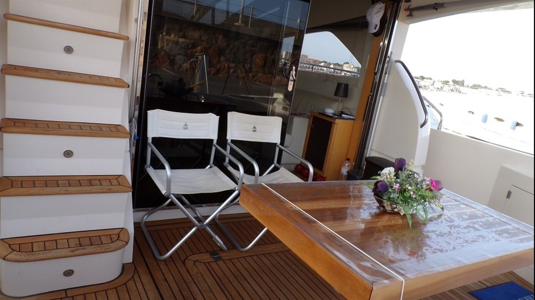 Обеденный стол и каюта экипажа расположены в кабине пилотов. В носовой части есть солнечная палуба с креслами. На флайбридже находится
