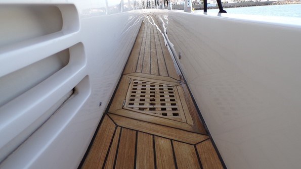 Kran. Die Plattform, das Cockpit und die Stege haben einen Teakholzboden. Das Cockpit hat einen Esstisch