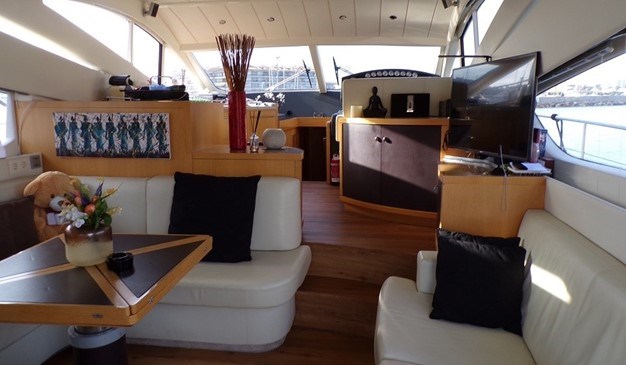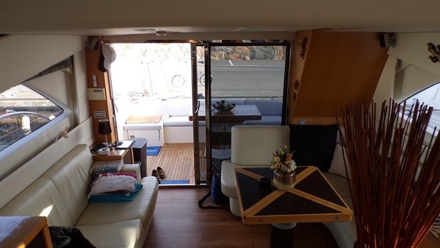 La mesa de comedor y la cabina de la tripulación se encuentran en la cabina. En la proa hay una terraza con asientos. En el flybridge es
