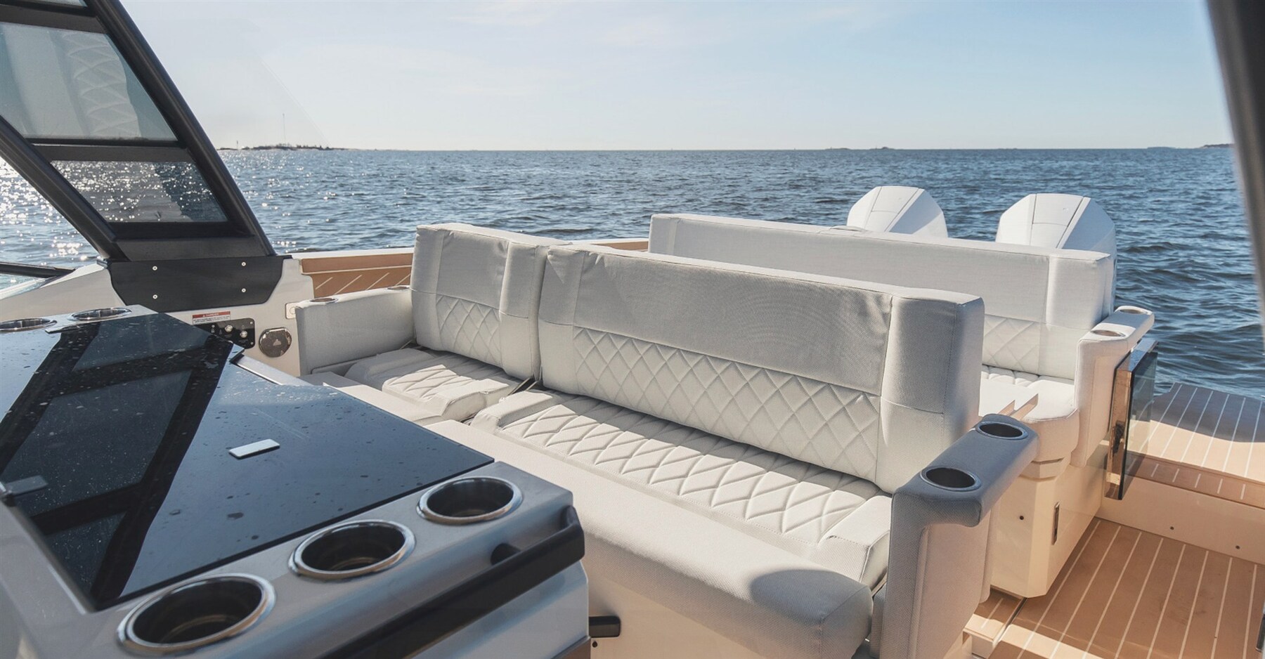 2 Alarme moteur, Alarme de pompe de cale, Eau sous pression, 4 Batteries, Hard top, Lavabo dans le cockpit, Éclairage de courtoisie, Plateforme arrière, 2 Pompe de cale automatique, Porte latérale, Echelle de bain, Corne.