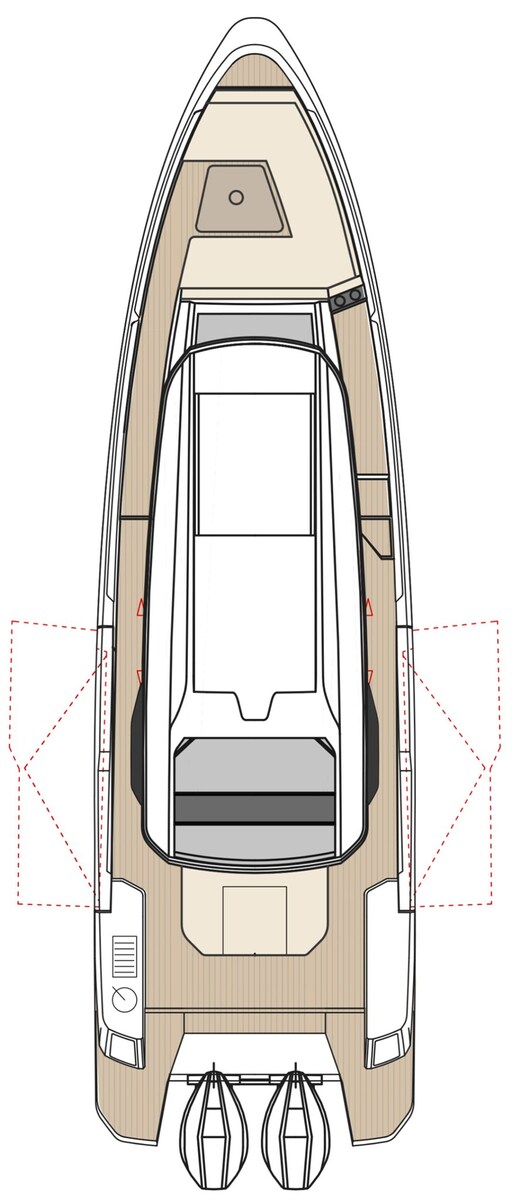 2 Motor Alarm, Bilge Alarm, Alternator, Elektrische trimflappen, Hardtop, Wasbak in de kuip, Sfeerverlichting, Platform, 3 Automatische bilgepomp, Ingangsdeur, Zijdeur, Zwemtrap, Kuiptafel, Hoorn.
