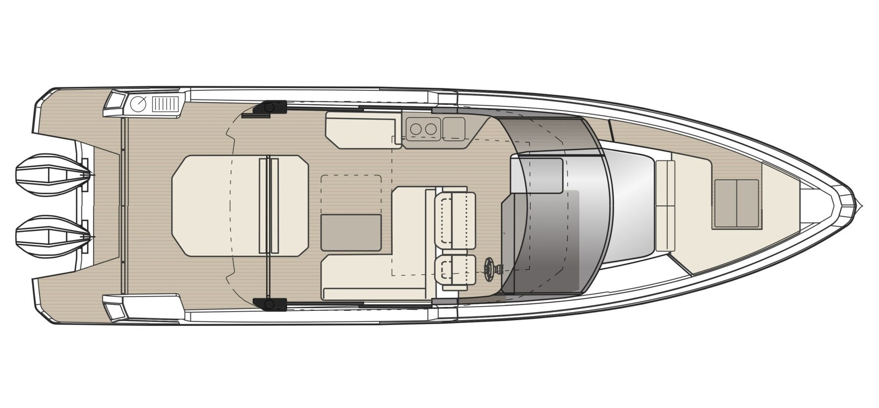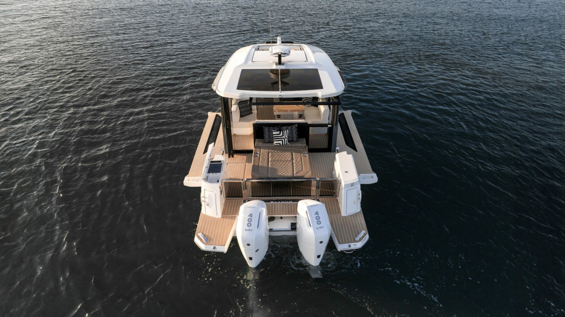 Saxdor 400 GTC разработан для двойных подвесных двигателей и использует эксклюзивную морскую архитектуру, гарантирующую незабываемые впечатления от плавания. Главная палуба отличается инновационным дизайном с рулевой рубкой во всю ширину, оптимизирующей внутреннее пространство. По сравнению с GTO, GTC добавляет нотку роскоши благодаря большим стеклянным поверхностям, которые создают светлую и гостеприимную среду, защищенную от непогоды. Планировка позволяет напрямую соединиться с боковыми террасами, чтобы отдых был похож на частный остров. Под палубой две лестницы ведут в двухместные каюты - носовую и среднюю - которые имеют общую ванную комнату; Также доступна дополнительная третья кровать для детей. Каждая деталь продумана с элегантностью и функциональностью. Свяжитесь с нами для получения дополнительной информации.