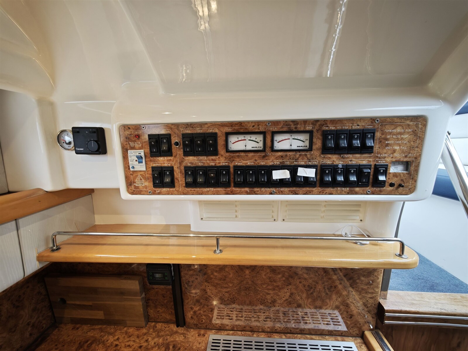 Тёплая вода, котлом, Установка для сточных вод, Индикатор уровня сточных вод в баке, Деревянный пол в интерьере, Внутренние розетки 12v, Внутренние розетки 220v, Электрический морской туалет.