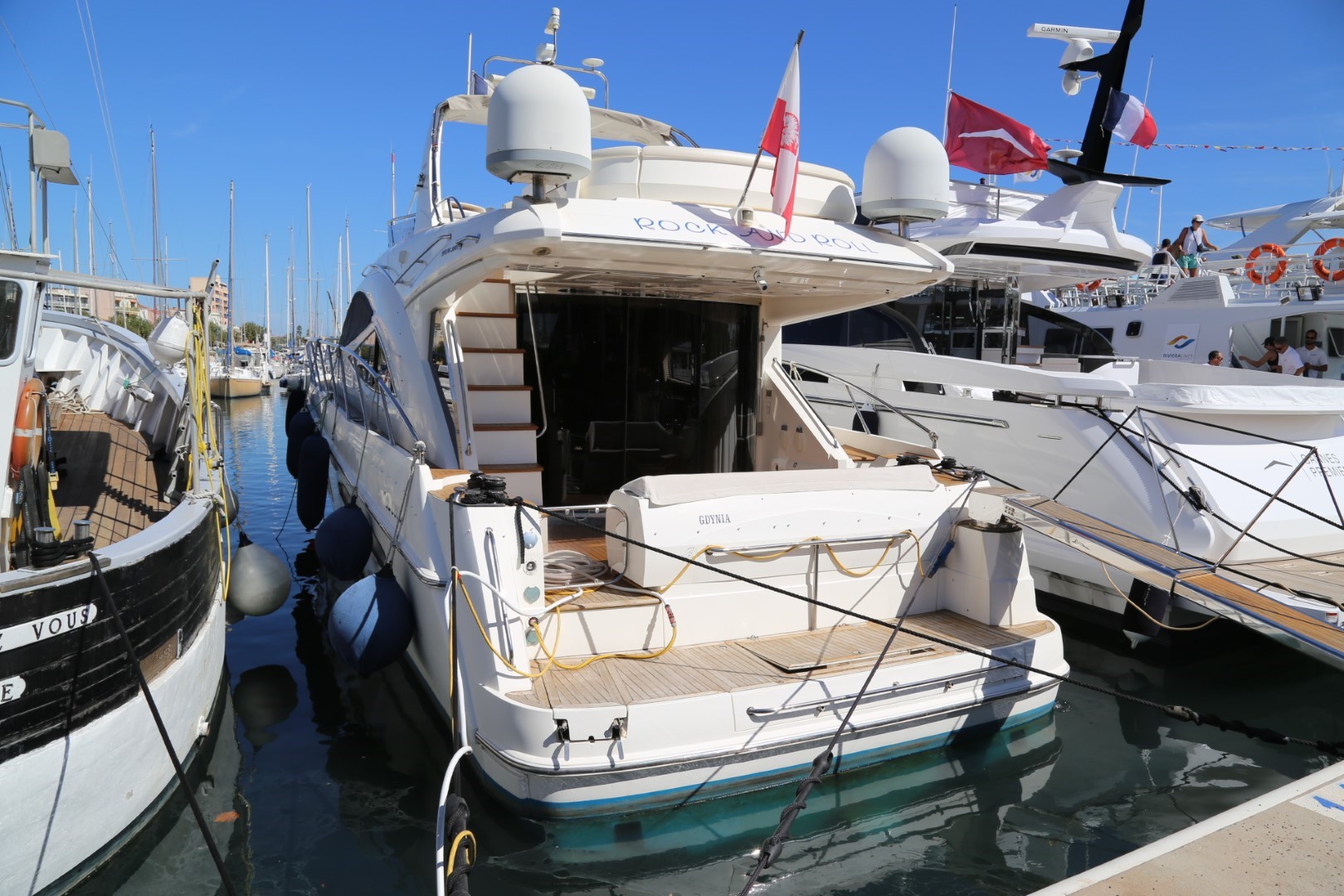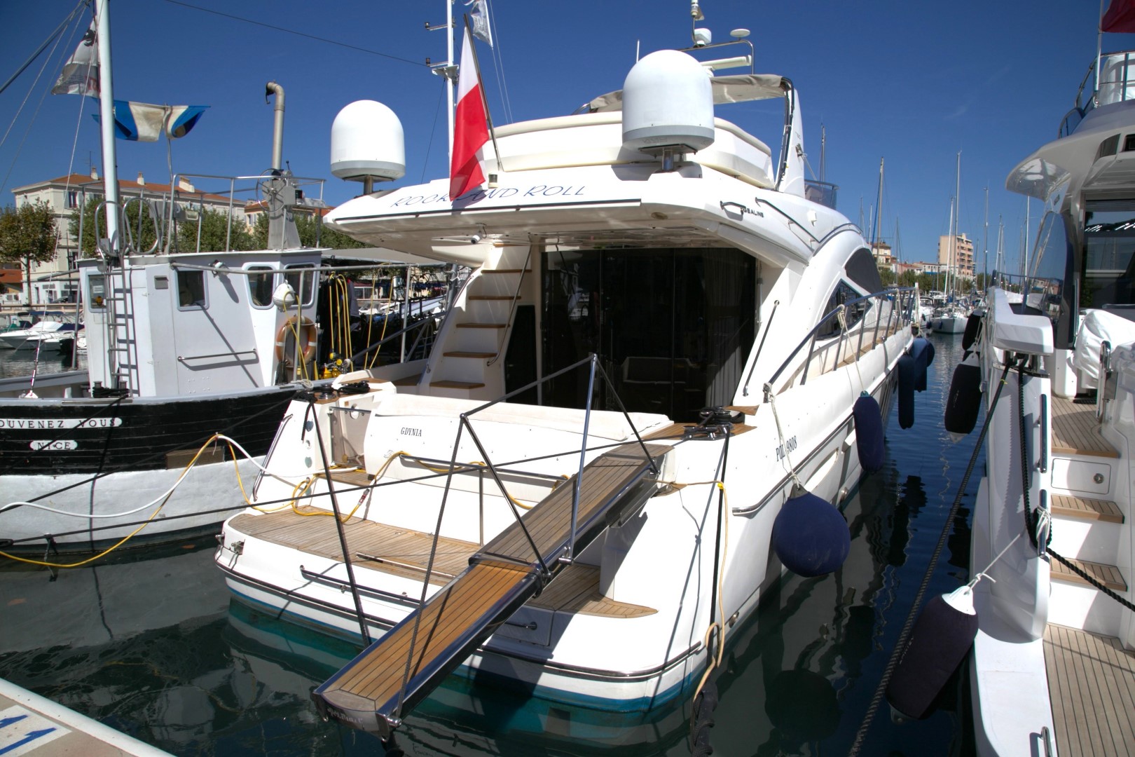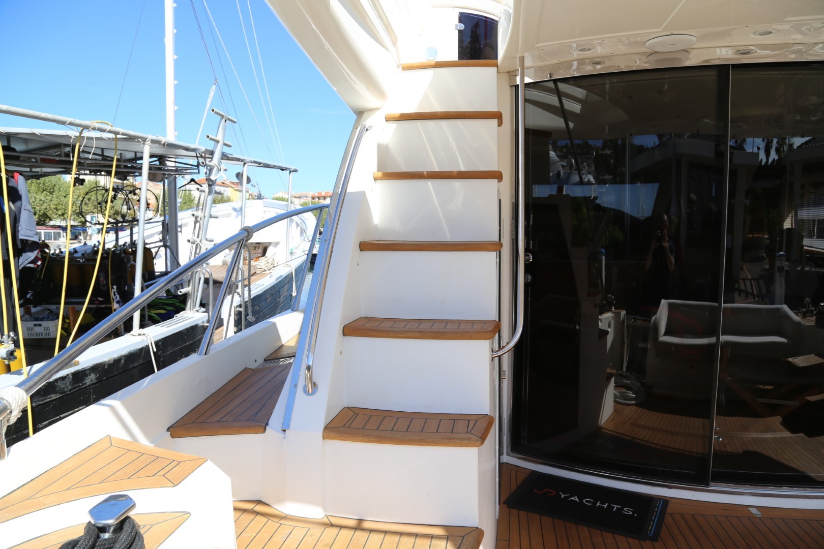 Stairway to flybridge, moulded with teak steps