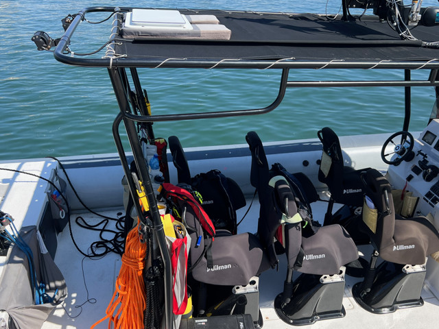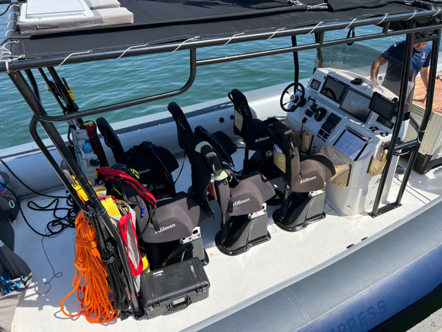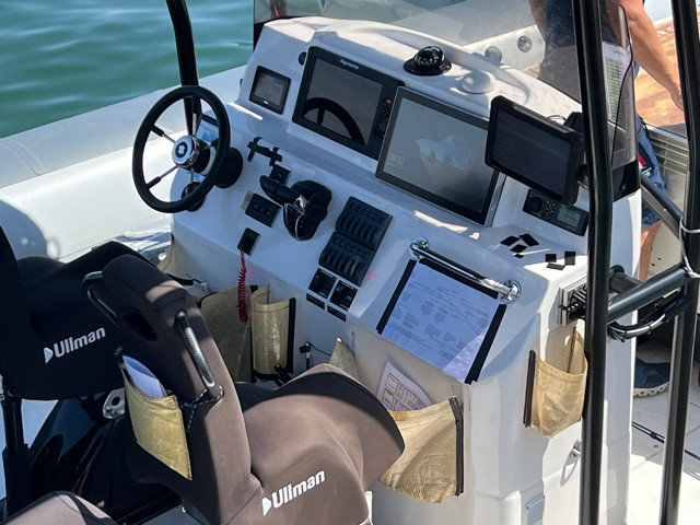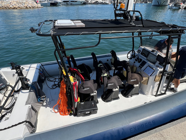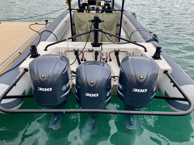 Equipado con 3 motores fuera de borda YAMAHA de 300 CV cada uno, 6 asientos Ulmann, una cuna, gran techo rígido.