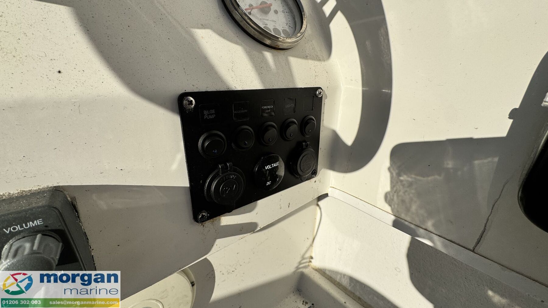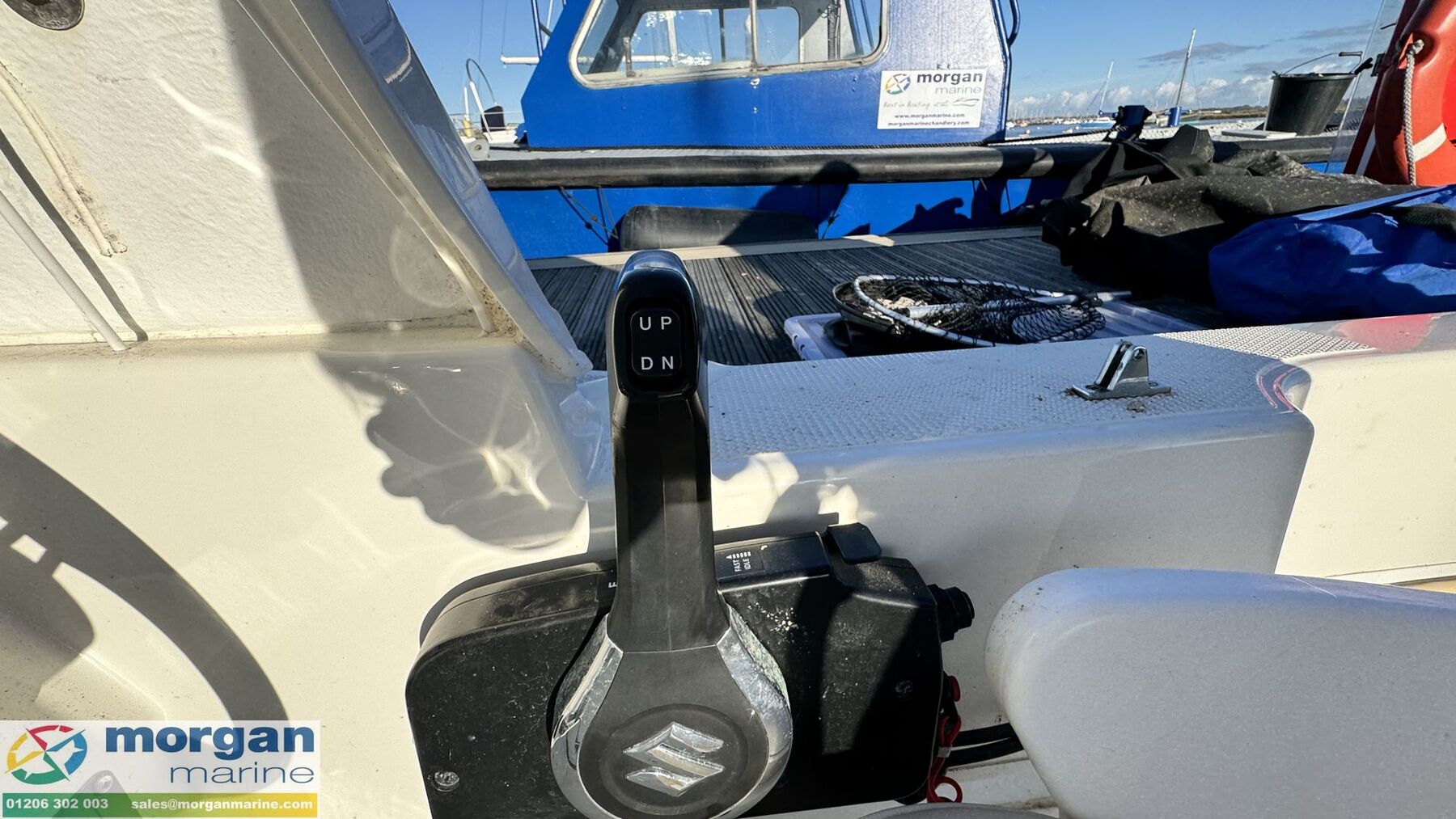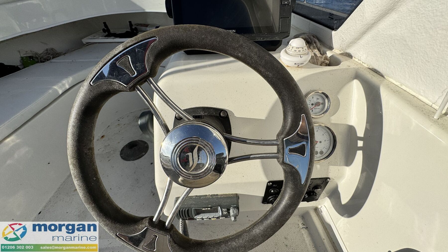 Electronics: Garmin chart plotter. Cobra VHF radio with GPS. 12v socket. USB socket. Manual and electric bilge pump. Foredeck light. Suzuki trim and RPM gauges. Switch panel. Anchor light. Navigation lights. Compass. Battery isolator.