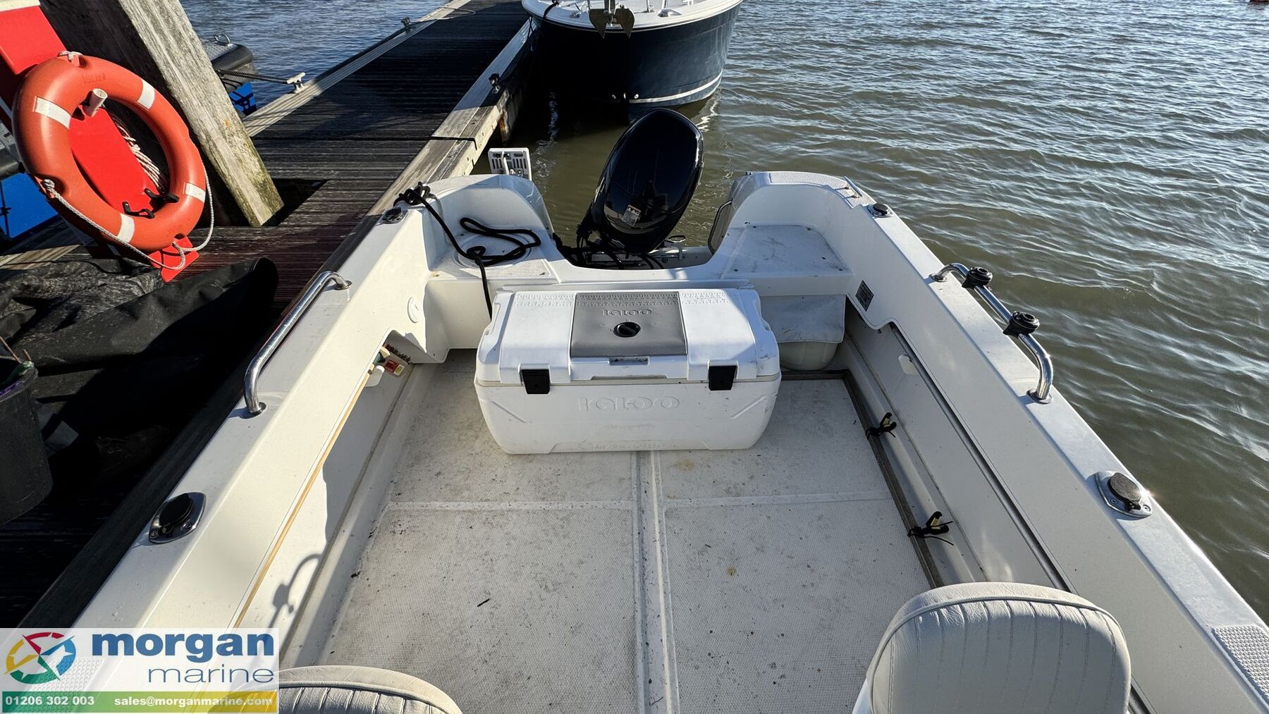 Cockpit: Adjustable and swivelling pilot and co-pilot bolster seats with backrest. Dash with steering wheel, electronics and engine controls. Port and starboard stern seating. Igloo cooler box.
