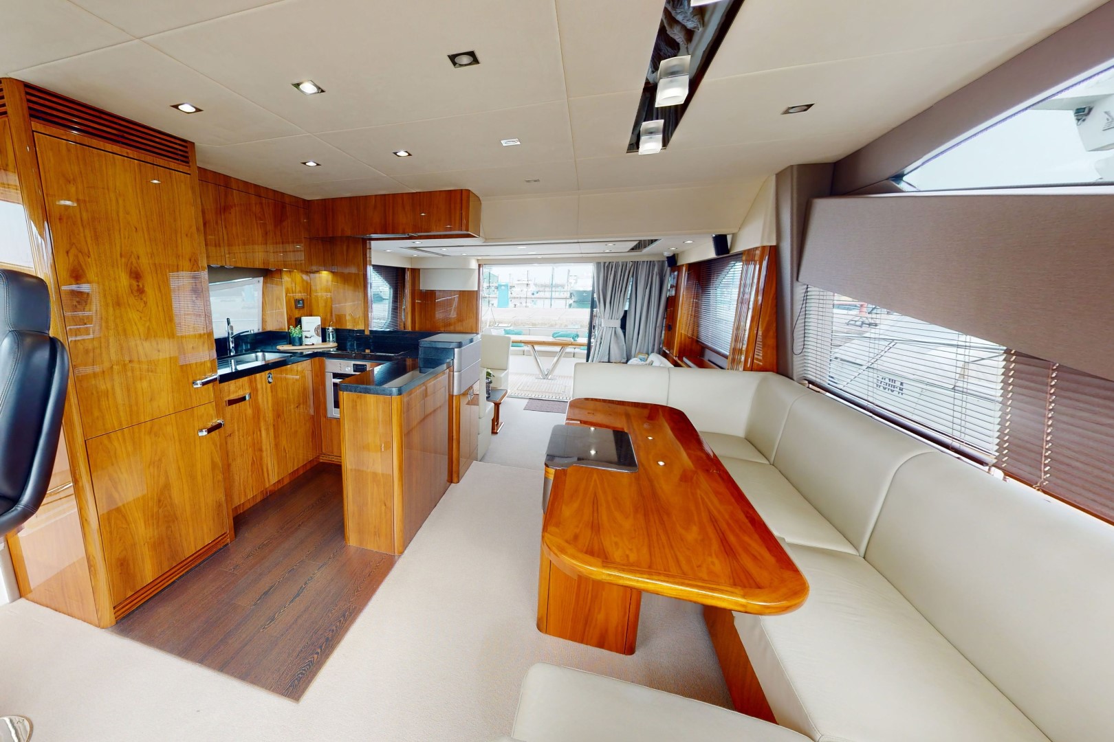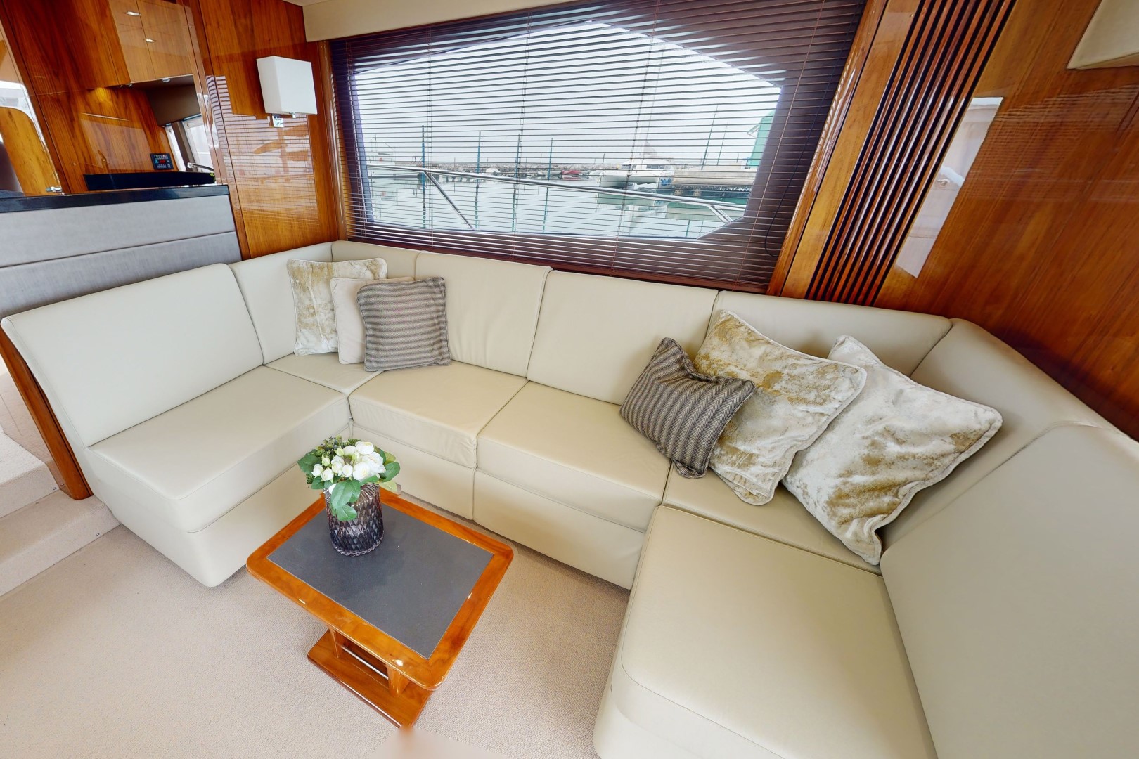 Panoramic side windows with opening portholes and blinds