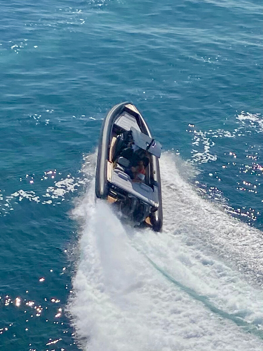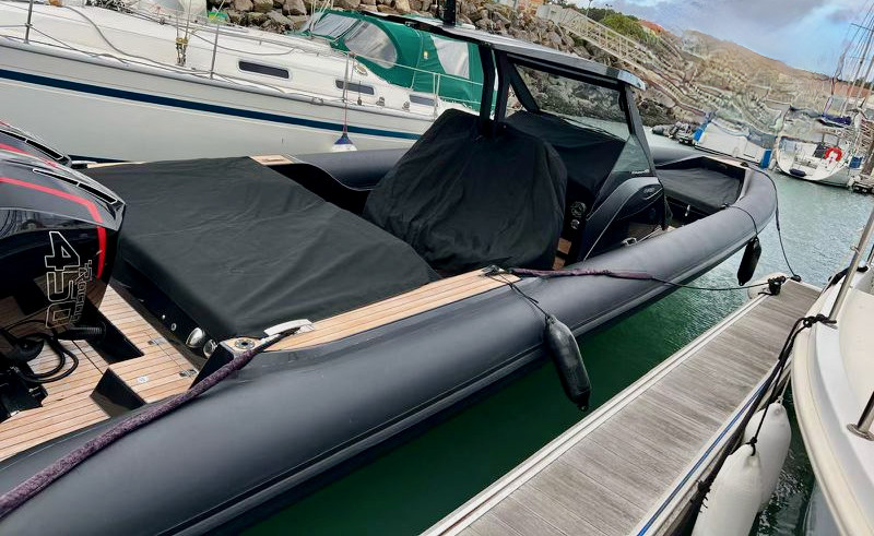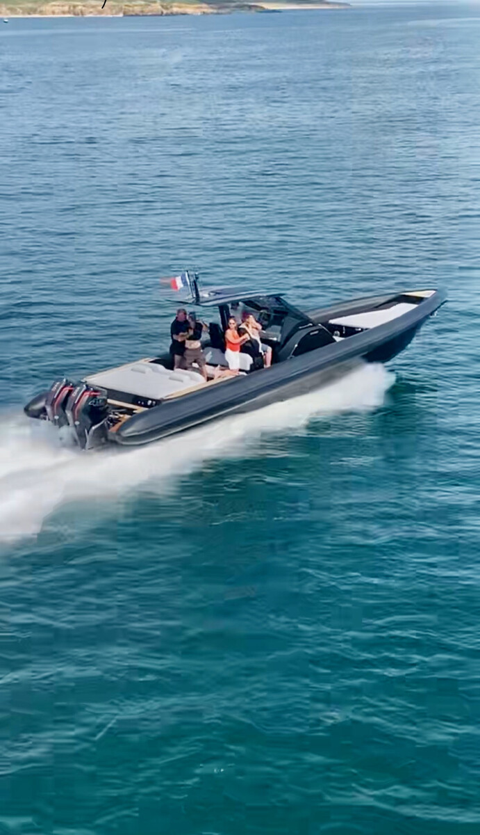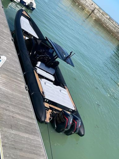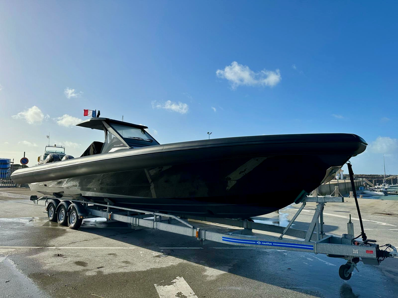 Technohull EXPLORER 40s from 2022 under the French flag, offered at the price including taxes. This luxury RIB is equipped with black ORCA 1670dtex neoprene hypalon tubes, a black gelcoat, and grey upholstery. The deck is made of teak, and the carbon T-TOP features a windshield with a wiper. The boat is also equipped with two refrigerators, a dual Raymarine Axiom PRO12’ display, a Raymarine VHF, and a FUSION Apollo series audio system with an amplifier and subwoofer.