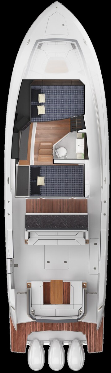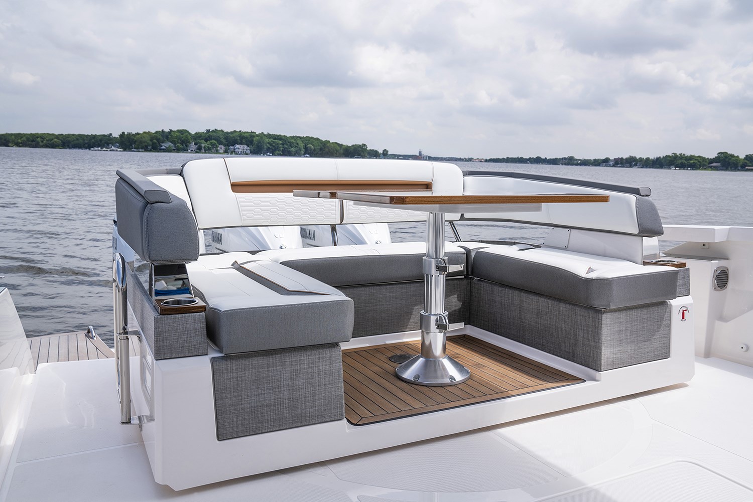 THE THIRD MODEL IN THE TIARA SPORT LS SERIES, THE 43 LS, COMBINE THE AESTHETIC OF SPORT STYLING WITH THE LUXURIOUS AMENITIES AND DETAILS SYNONYMOUS WITH THE TIARA SPORT BRAND. VOUS POURREZ CHOISIR PARMI PLUSIEURS ZONES SOCIALES POUR SE DÉTENDRE ET SE PRÉMILLISER. FORWARD, THE BOW FEATURES WRAP AROUND SEATING WITH A RECLINING LOUNGE. THE HELM SEATS FOUR COMFORTABLY, WITH STANDING ROOM AND A LEANING BOLSTER JUST AFT, PROVIDING A SECURE ZONE FOR MORE GUESTS WHILE UNDERWAY. A SIDE BOARDING DOOR LOCATED PORTSIDE PRESENTS ACCESS TO VOTRE FAVORITE WATER ACTIVITIES. THE INNOVATIVE AFT U-LOUNGE ROTATES 180 ALLOWING GUESTS TO FURTHER ENJOY THE SWIM PLATFORM AND BEAUTIFUL VIEWS. ENTERTAIN EVERYONE ABOARD FROM THE GALLEY, WELL EQUIPPED WITH SINK, COOLER AND LARGE COUNTERTOP. BELOW DECK, COMFORTABLE ACCOMMODATIONS FOR FOUR AWAIT. APPELEZ POUR PLUS DE DÉTAILS.