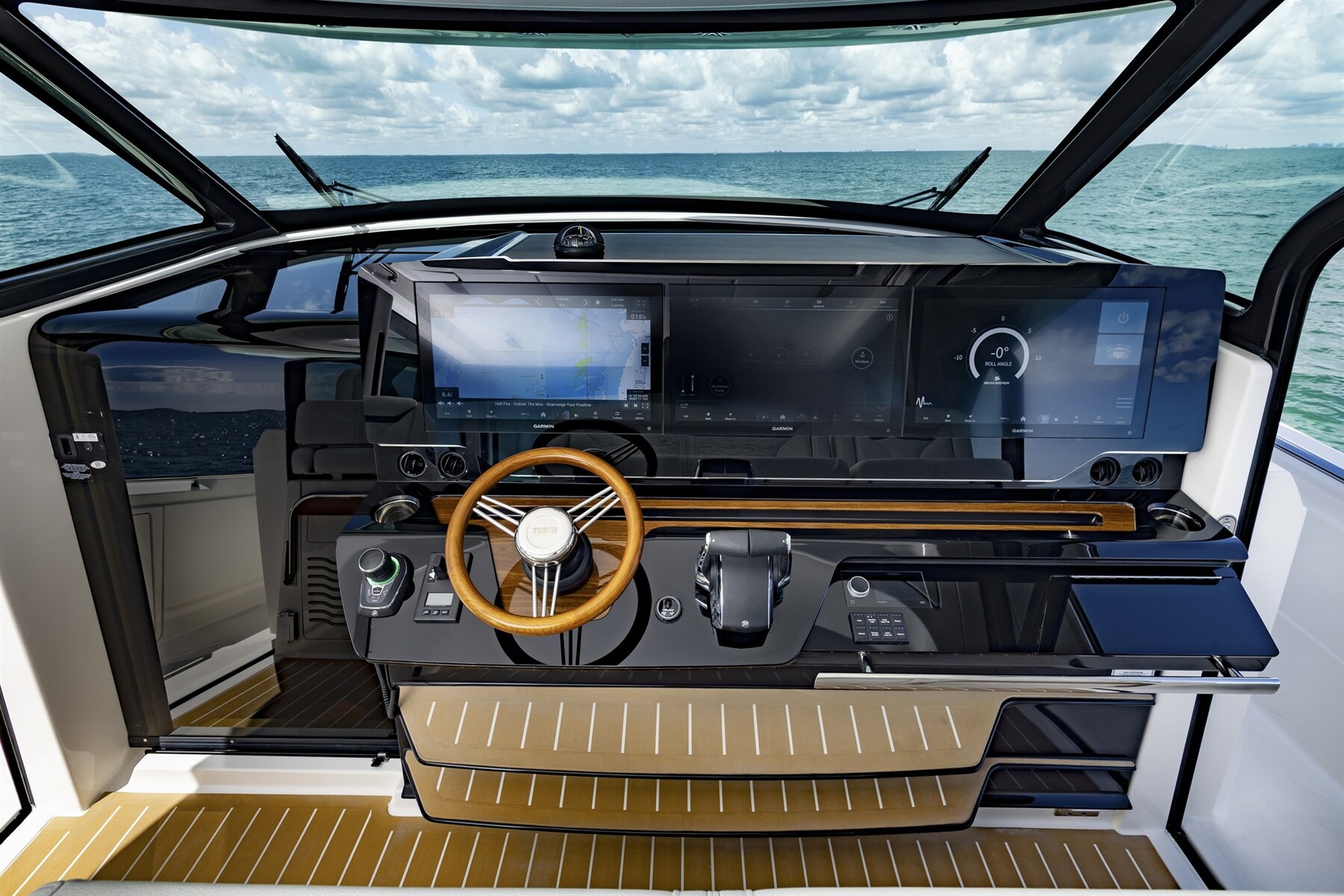 Угол поворота, антенна РЛС (Garmin, Open Array), Компас (Ritchie SuperSport), Electronic engine control (Mercury), Бортовой компьютер (Mercury), спидометр (Garmin), Эхолот (Garmin), GPS (Garmin), Джойстик (Mercury JPO), Автопилот (Mercury), 3 плоттера (Garmin Touch), Радио VHF (Garmin), Место второго пилота.