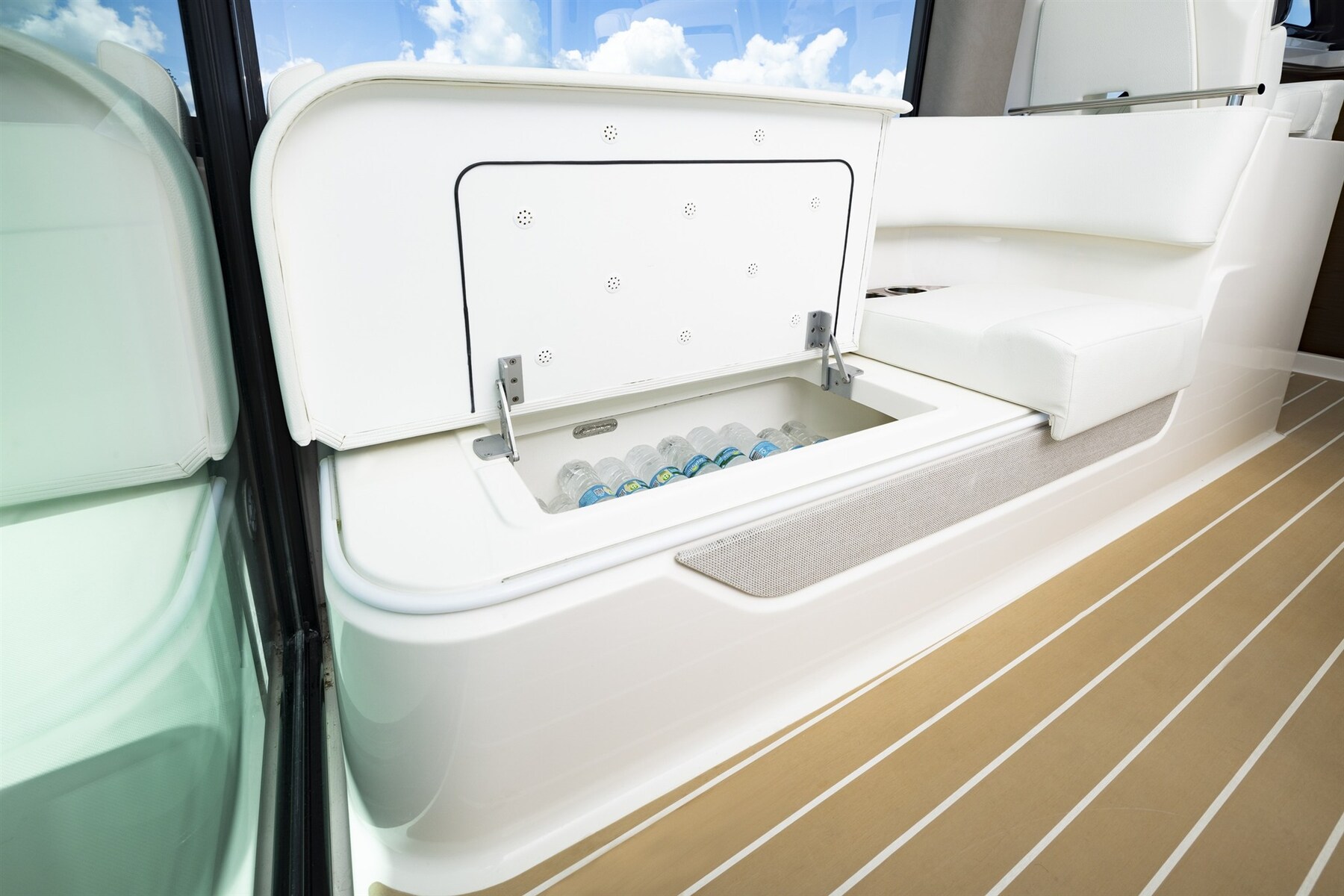 Indicateur d'angle de barre, Antenne radar (Garmin, Open Array), Compas (Ritchie SuperSport), Commande électrique (Mercury), Ordinateur fixe de bord (Mercury), Loch (Garmin), Sondeur pêche (Garmin), GPS (Garmin), Joystick (Mercury JPO), Pilote automatique (Mercury), 3 Lecteur de cartes (Garmin Touch), Radio VHF (Garmin), Siège copilote.