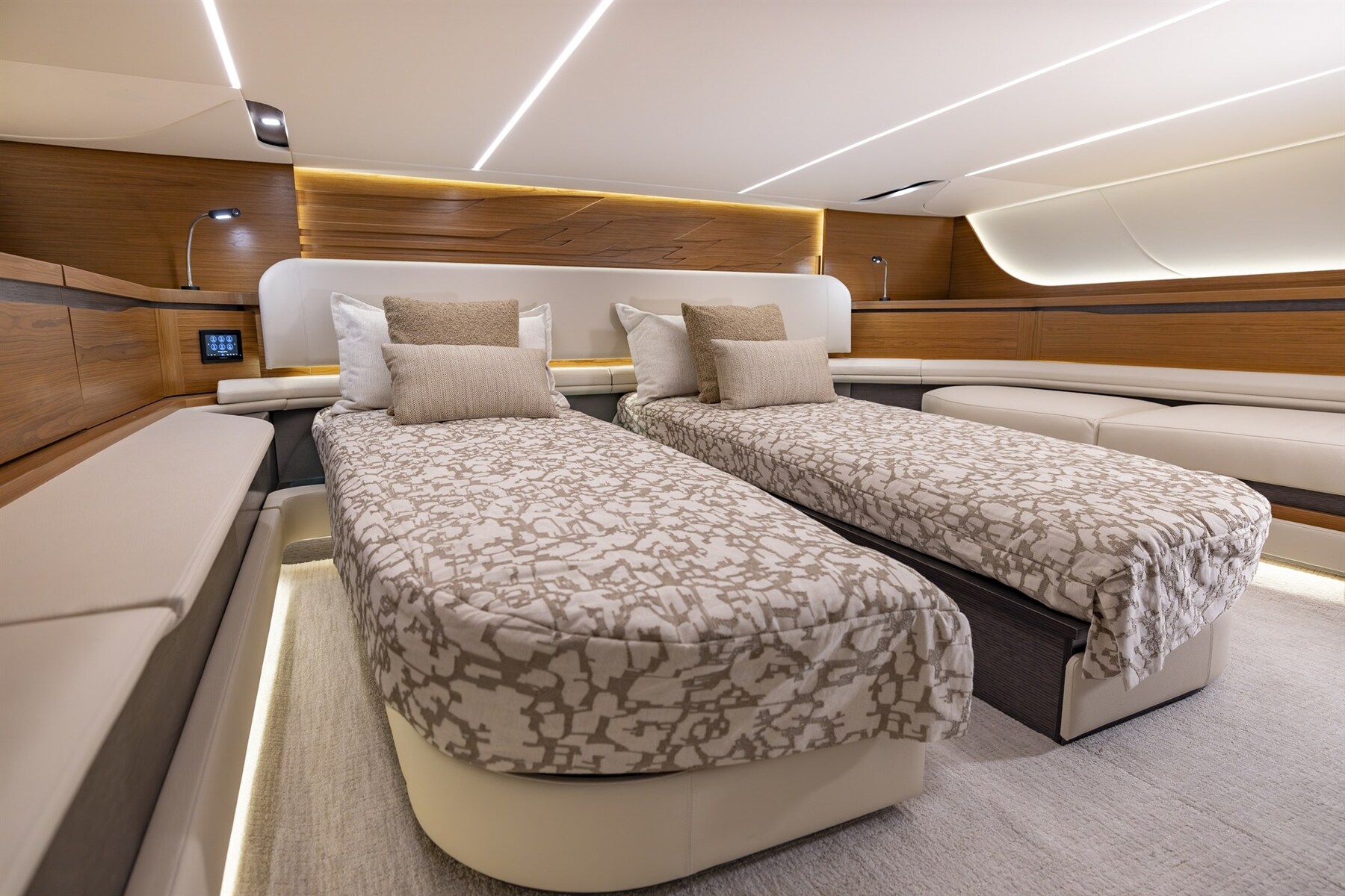 Alarme gaz, 4 Alarme moteur, Alarme de pompe de cale, Couleur spéciale (a scelta, standard), Douche de cockpit, Flaps électriques (Zipwake Dynamic Trim control system), Hard top (elettrico), Extincteur(s) fixe(s), Indicateurs de flaps, Lavage de chaine, Lavabo dans le cockpit, Éclairage de courtoisie, Spots sous-marins, Plateforme arrière, 3 Pompe de cale automatique, Porte latérale, Prise de quai, Connexion eau sous pression à quai, Onduleur, Guindeau électrique, Echelle de bain, table de cockpit, Filières avec sortie latèrale, Corne.