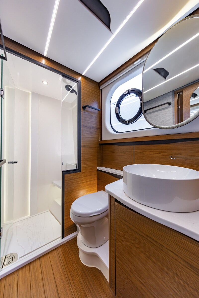 BBQ/ Grill, Boiler (bivalente), Clima reversibile, Impianto acque nere, Pavimento interno in legno, Prese interne 12v, Prese interne 220v, Serbatoio Acque Nere, 2 WC marino elettrico.