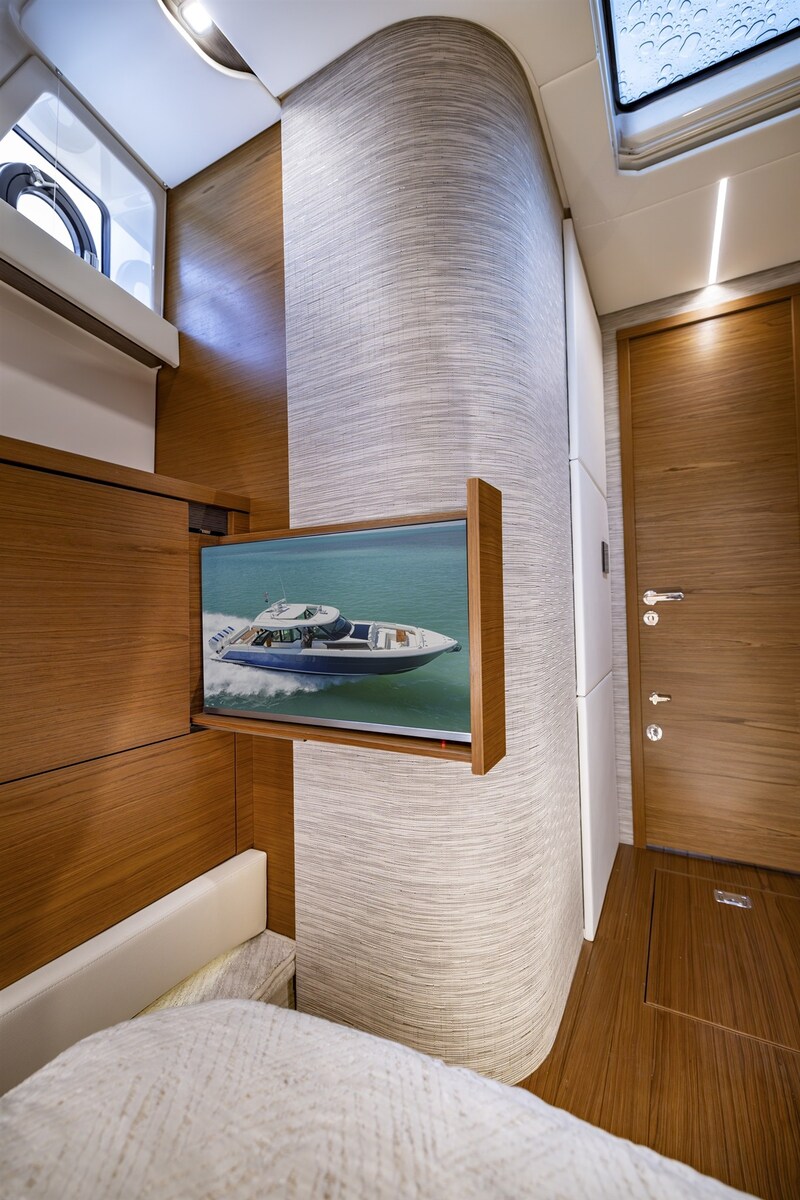 Fume/Gas Detector, 4 Engine Alarm, Bilge Alarm, Special Colour (a scelta, standard), Deck Shower, Electric Flaps (Zipwake Dynamic Trim control system), Hard top (elettrico), Fire Extinguishing System, Flaps Indicators, Anchor Chain Washdown, Washbasin in the cockpit, Courtesy Lights, Underwater lights, Platform, 3 Automatic Bilge Pump, Entry door, Shorepower connector, Water harbor connector system, Voltage Rectifier, Electric Windlass, swimming ladder, cockpit table, guard rails with gates, Horn.