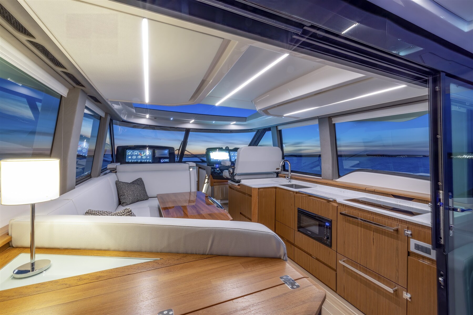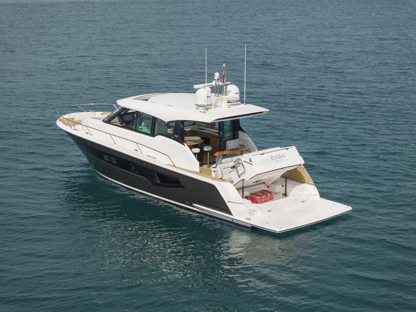 The EX 54 offers three aft cockpit module selections, making each vessel uniquely personalized to their owner. Cruise and entertain or opt to enjoy your favorite water activities from the twin terraces and swim platform with integrated steps. Forward, the easily accessible bow provides yet another exterior relaxation zone. Interior, the salon and galley offer plenty of amenities and comforts for dining and entertaining. Below deck, three peaceful and private sleeping accommodations for six adults alongside two heads provide space and comfort for all onboard. Continuing our partnership and experience with Volvo Penta as well as Garmin® electronics, Twin IPS2 950s pair with the latest Volvo technology including glass cockpit, assisted docking and aft-facing camera. Quiet, Bluewater performance encourages you to explore for the day, weekend or week with your family and friends. Contact us for more details.