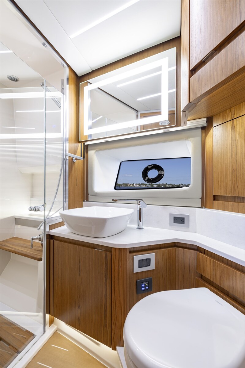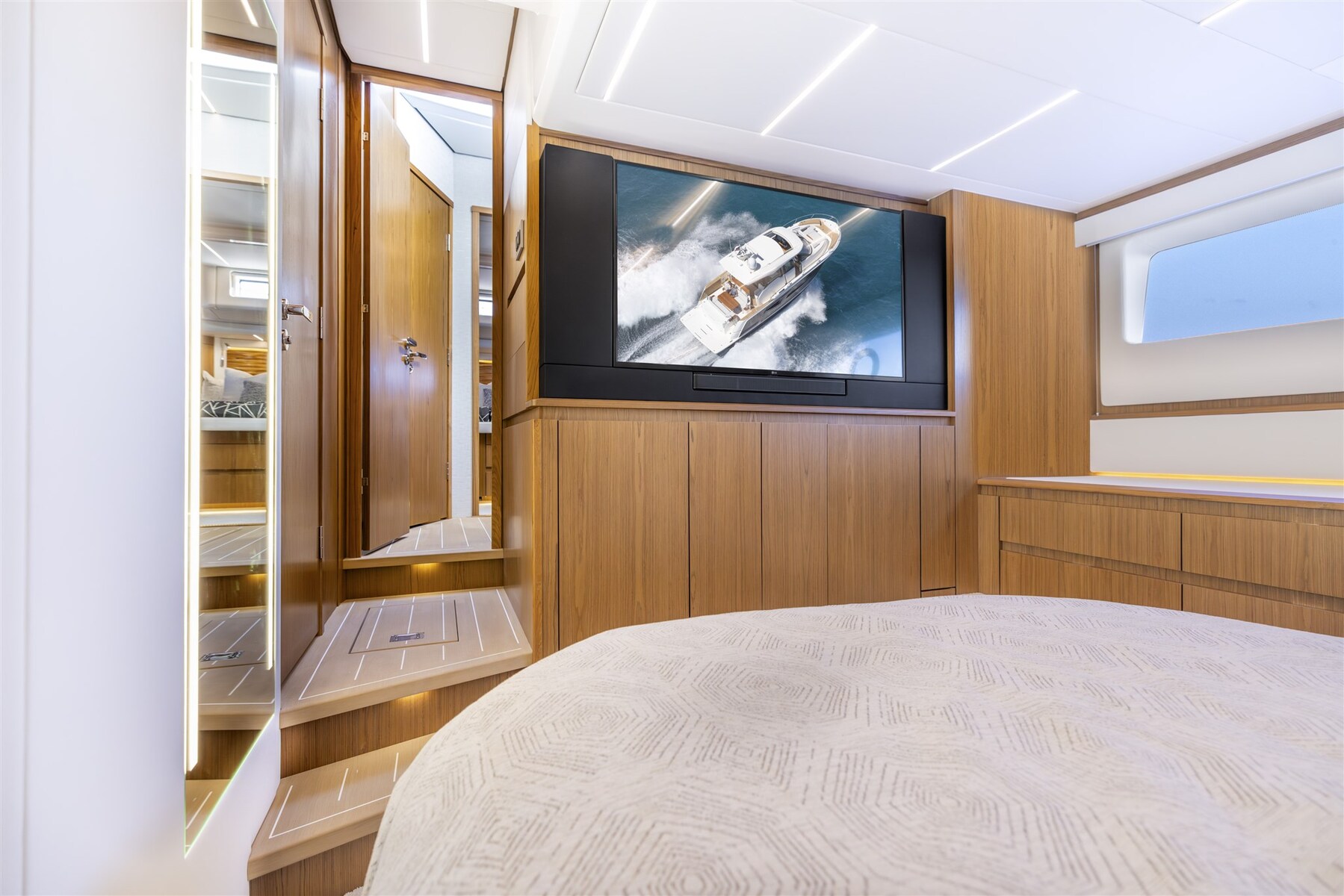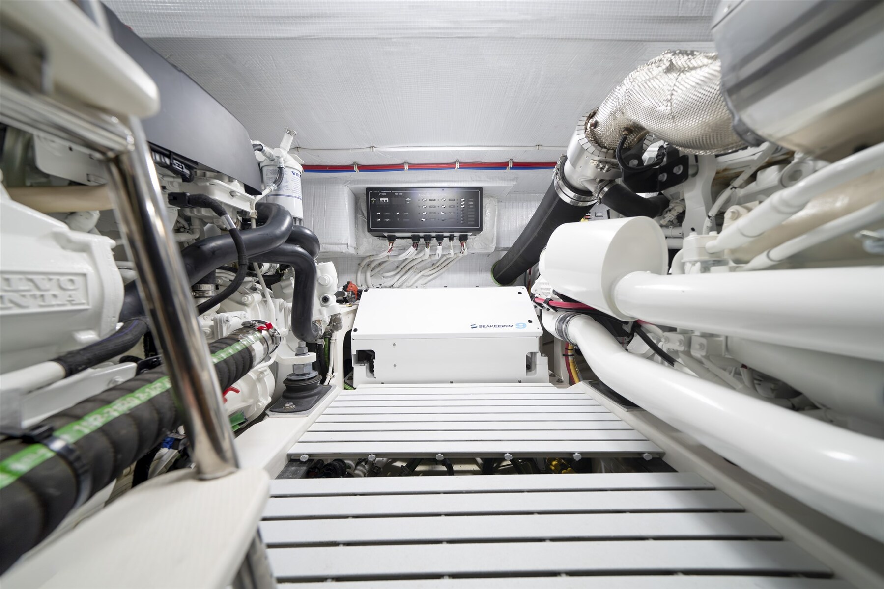 Fume/Gas Detector, 2 Engine Alarm, Bilge Alarm, Auto Dynamic Trim Interceptor, Water pressure pump, Special Colour (a scelta), Deck Shower, Headlights fixed on the stem, Electric Flaps, Hard top (elettrico), Fire Extinguishing System, Anchor Chain Washdown, Washbasin in the cockpit, Courtesy Lights, Underwater lights, Platform, 5 Automatic Bilge Pump, Entry door, Side door, Shorepower connector, Water harbor connector system, Voltage Rectifier, Electric Windlass, swimming ladder, cockpit table, guard rails with gates, Horn.