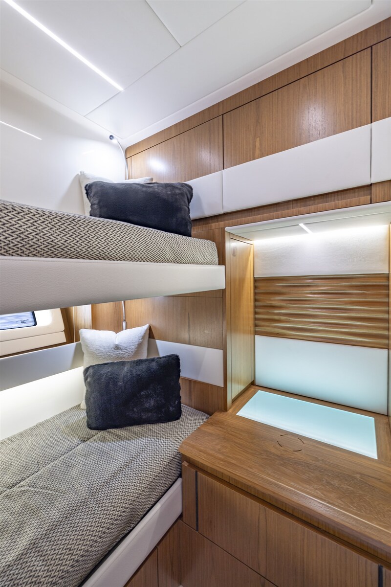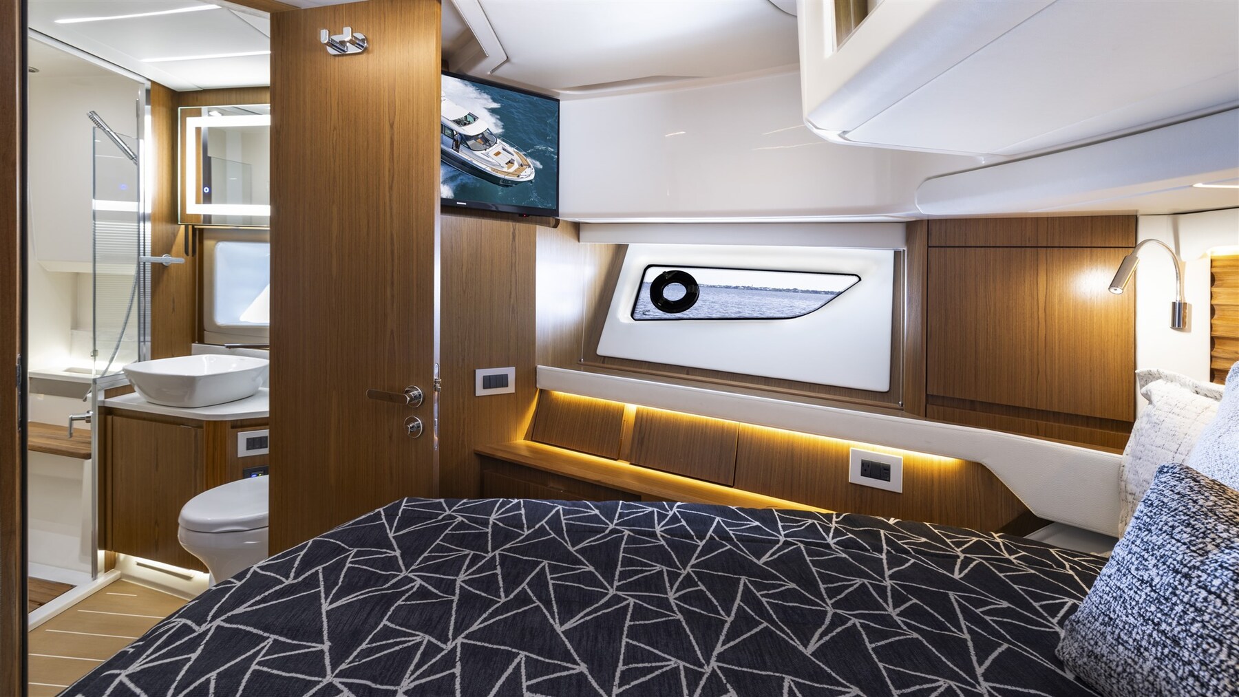 Die EX 54 bietet drei Achtercockpit-Module, so dass jedes Schiff individuell auf seinen Eigner zugeschnitten ist. Fahren Sie und unterhalten Sie sich oder genießen Sie Ihre Lieblingswasseraktivitäten von den Doppelterrassen und der Badeplattform mit integrierten Stufen aus. Im vorderen Bereich bietet der leicht zugängliche Bug eine weitere Entspannungszone im Außenbereich. Das Interieur, der Salon und die Kombüse bieten viele Annehmlichkeiten und Komfort zum Essen und Unterhalten. Unter Deck bieten drei ruhige und private Schlafgelegenheiten für sechs Erwachsene und zwei Nasszellen Platz und Komfort für alle an Bord. Die Twin IPS2 950 setzen unsere Partnerschaft und Erfahrung mit Volvo Penta und Garmin® Elektronik fort und sind mit der neuesten Volvo-Technologie ausgestattet, darunter ein Glascockpit, ein unterstütztes Andocken und eine nach hinten gerichtete Kamera. Die ruhige Bluewater-Leistung ermutigt Sie, einen Tag, ein Wochenende oder eine Woche mit Ihrer Familie und Ihren Freunden zu erkunden. Kontaktieren Sie uns für weitere Informationen.
