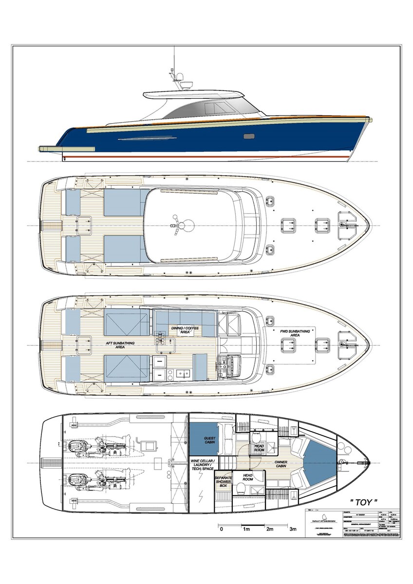 антенна РЛС, Electronic engine control, Бортовой компьютер, Сеть счетчик, спидометр (Raymarine), Эхолот (Raymarine), GPS (Raymarine), Джойстик (con Skyhook), плоттера (Raymarine Touch), Радар (Raymarine).