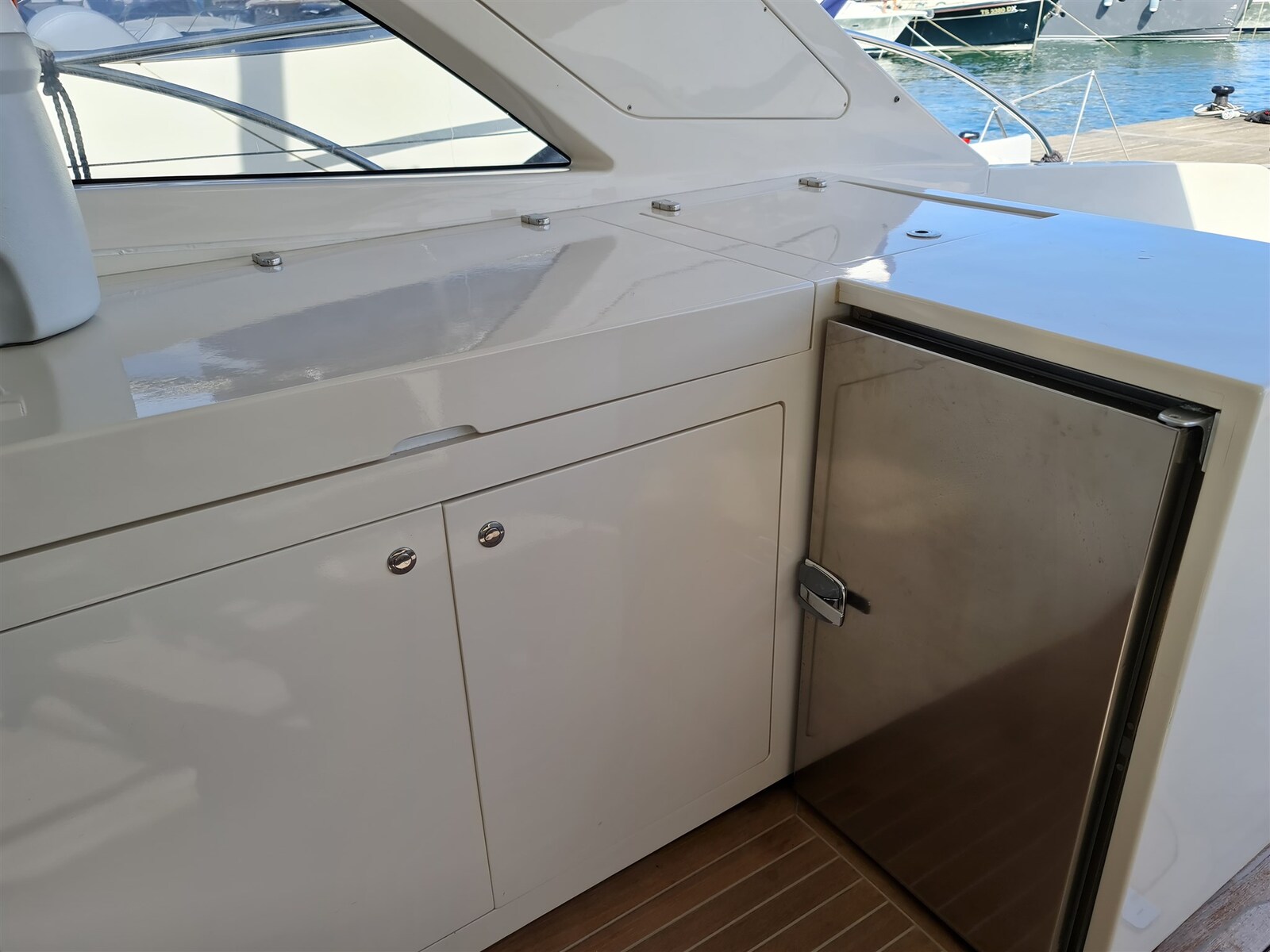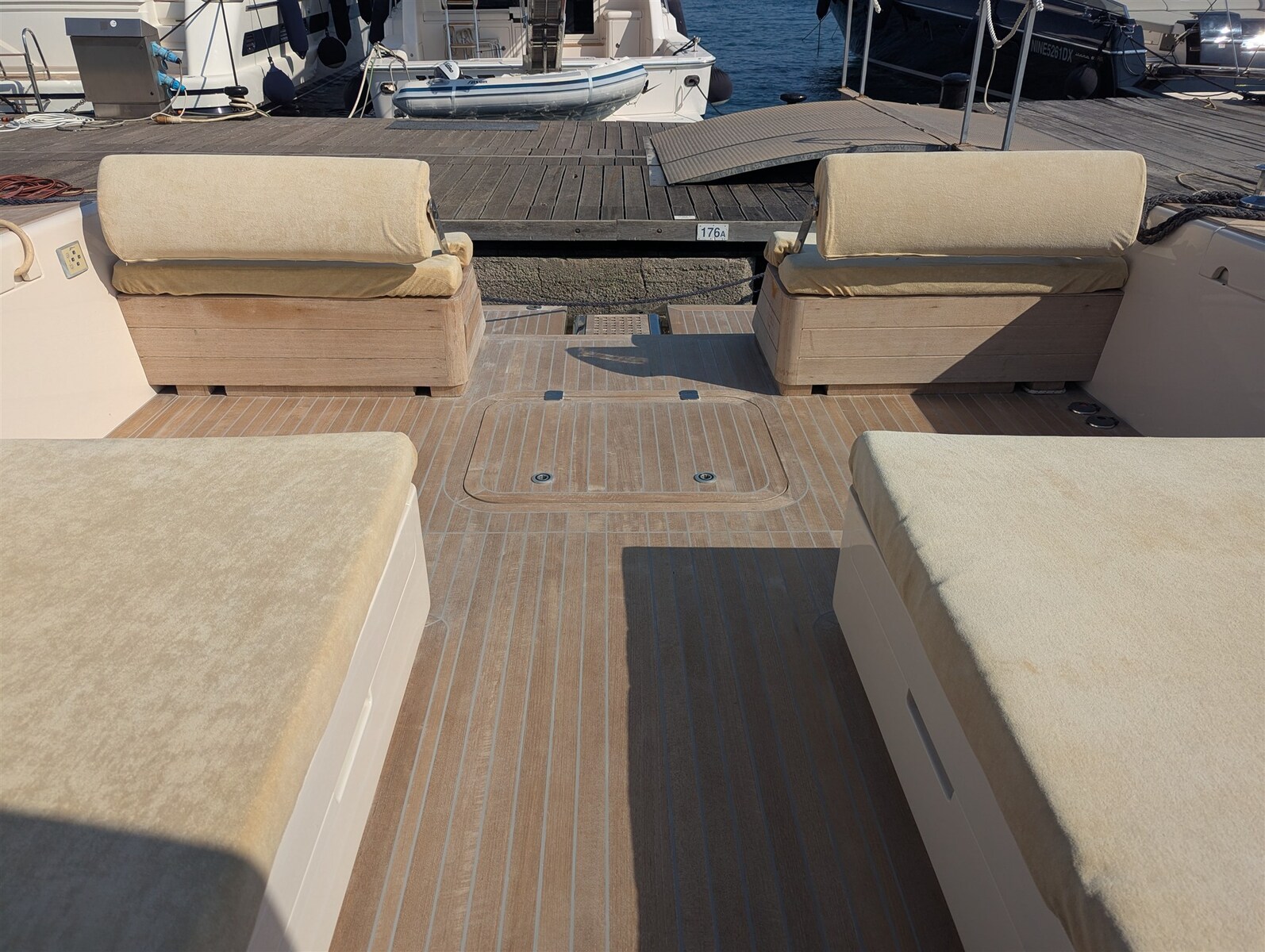 2 Engine Alarm, Bilge Alarm, Water pressure pump, Teak Side Decks, Special Colour (azzurra), Deck Shower, Directional Spotlight (con remote control), Hydraulic Flaps, Hard top, Fire Extinguishing System, Courtesy Lights, Underwater lights, Gangway (elettroidraulica), Platform, 3 Automatic Bilge Pump, Entry door, Teak Cockpit, Shorepower connector, Voltage Rectifier, Electric Windlass, swimming ladder, cockpit table (in dinette), Horn.