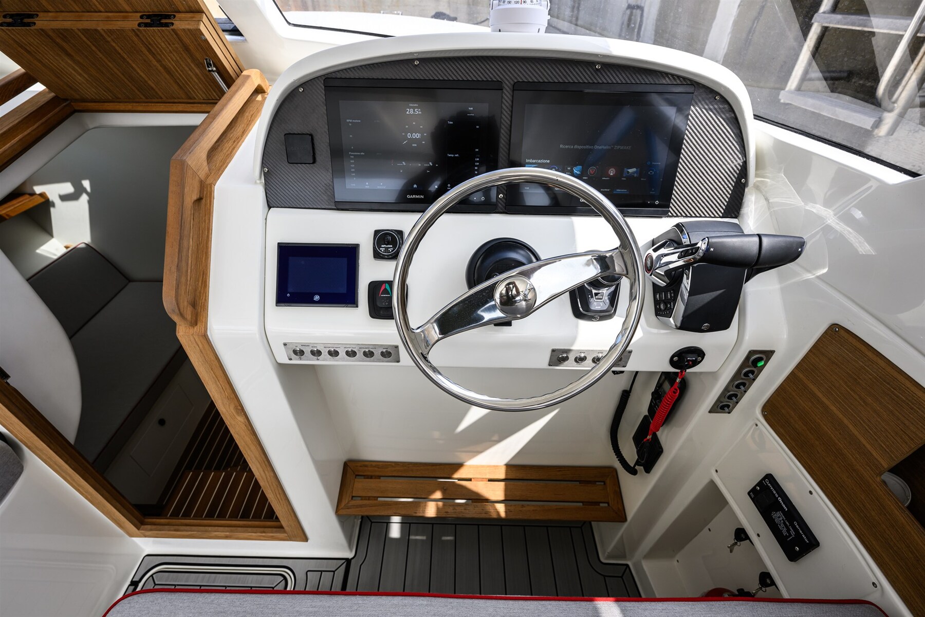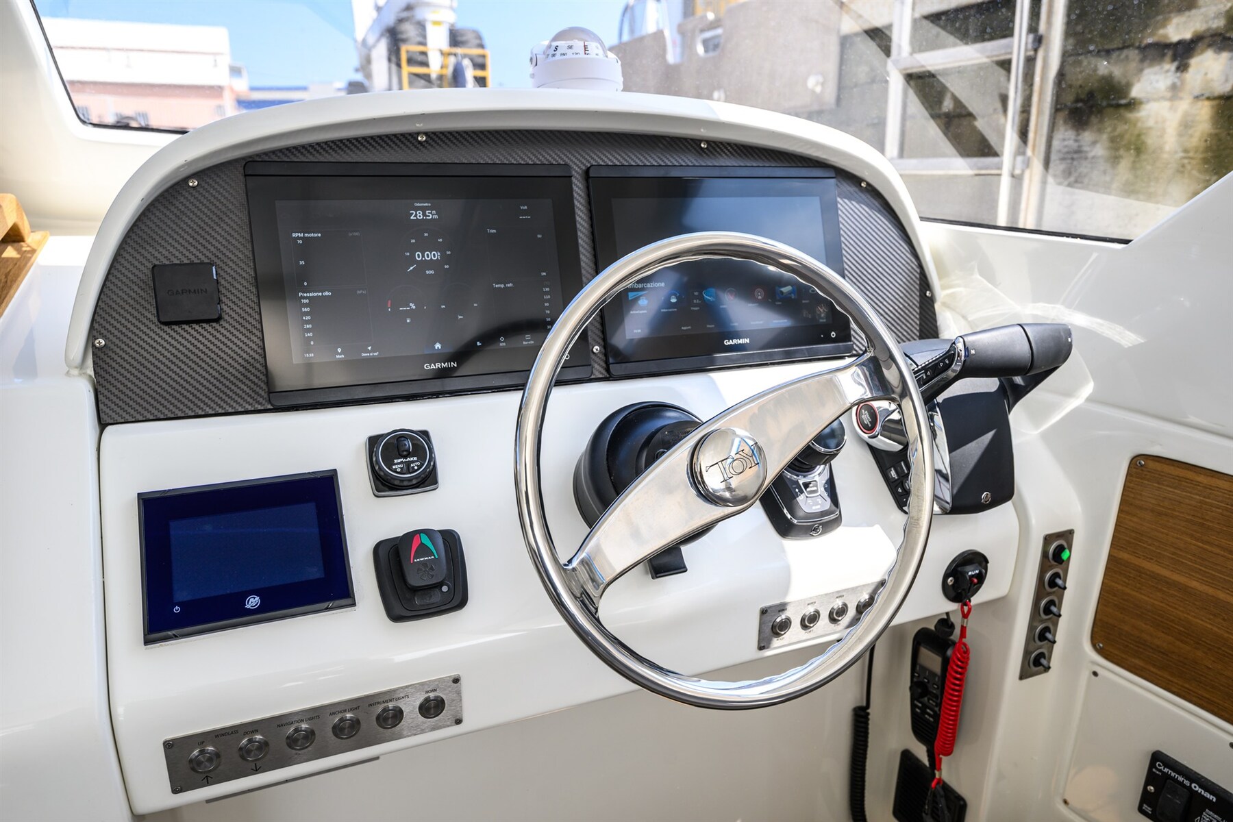 Angolo barra, Antenna radar, Comando motori elettronico, Computer di bordo (Mercury), Contametri catena, Ecoscandaglio (Garmin), GPS (Garmin), Pilota automatico (Garmin), Plotter (Garmin), Quadro comandi, Radar (Garmin).