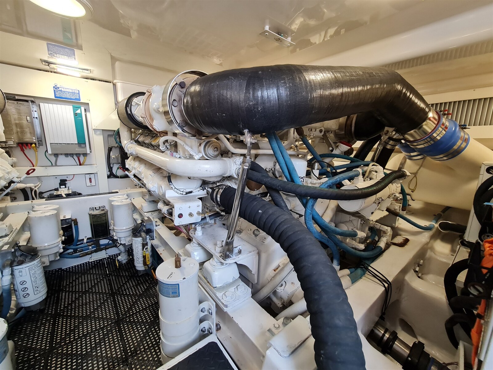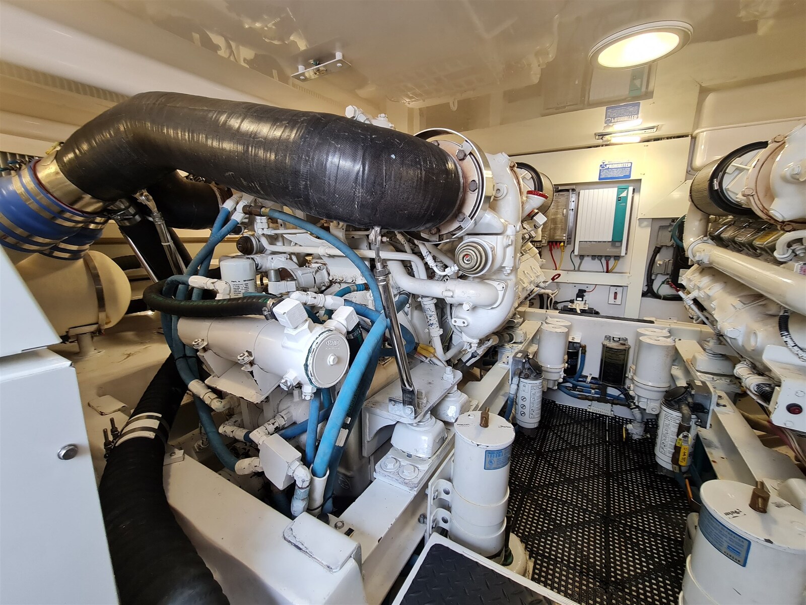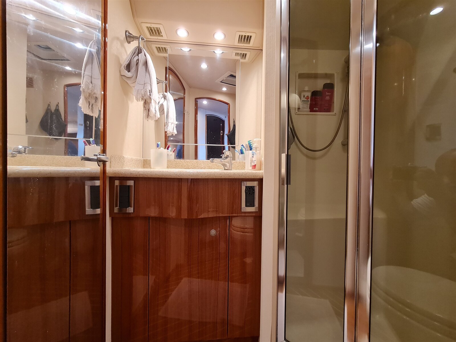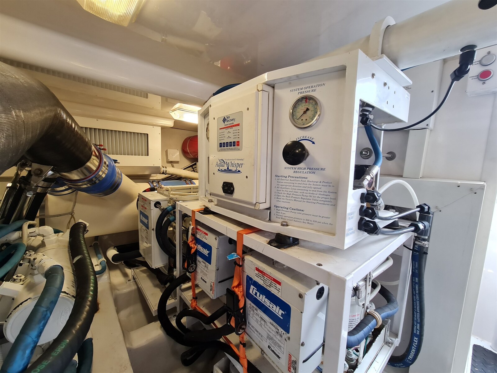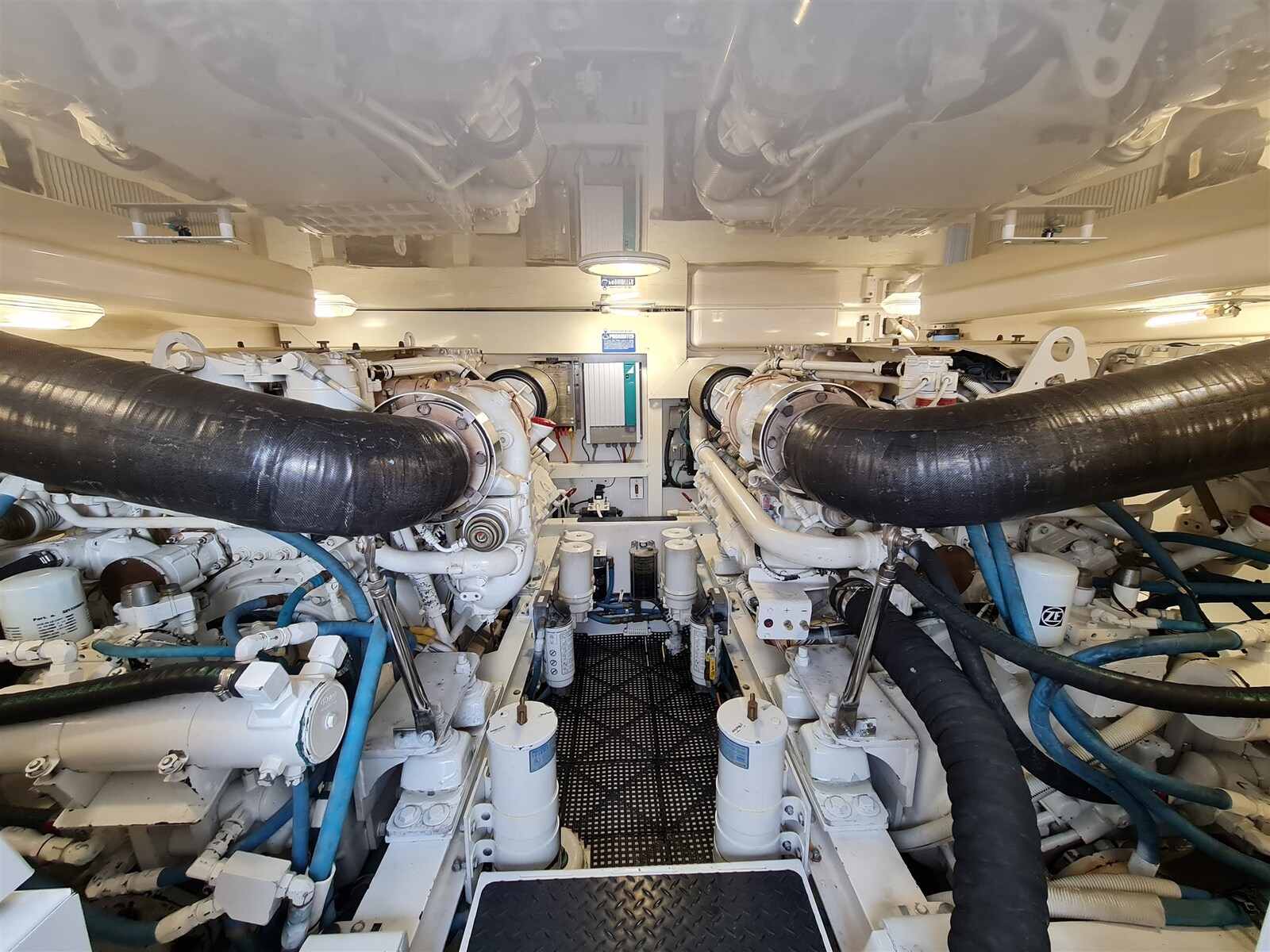 Gas Alarm, 2 Motoralarm, Bilgealarm, Druckwasserpumpe, 8 Batterien, Sonderfarbe, Cockpitdusche, Scheinwerfer am Heck, Trimmklappen hydraulisch, Hardtop (Con chiusure laterali e drop curtain), Feuer-Löschanlage, Nachtbeleuchtung, Gangway (Idraulica a 3 stadi), Plattform, 3 automatische Bilgepumpe, manuelle Bilgepumpe, Eingangstür, Teak im Cockpit, Landanschluß, Wasseranschluss, Rectifier, elektrische Ankerwinde, Badeleiter, Signalhorn, Verholwinde auf dem Vordeck.