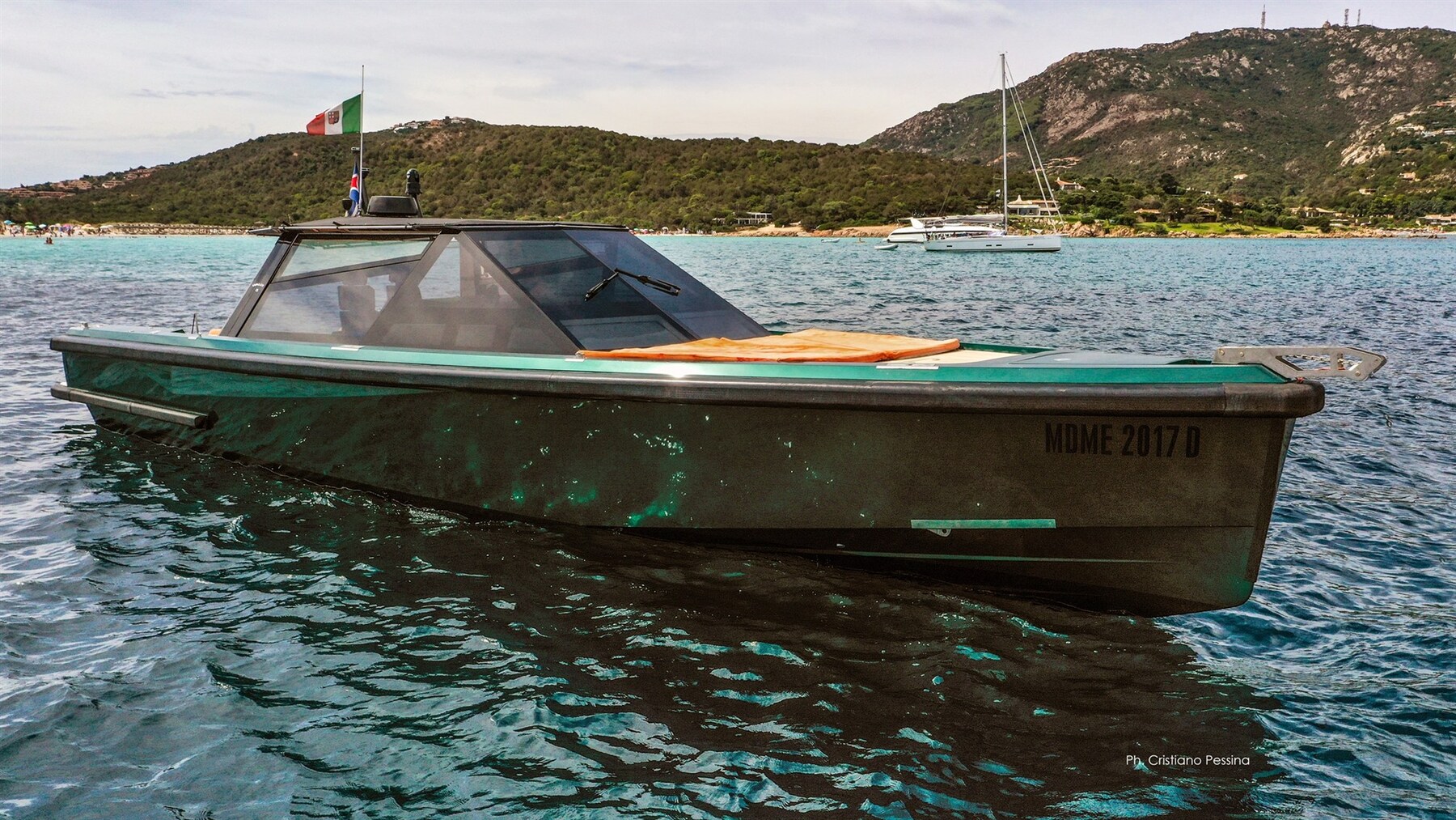 2 Engine Alarm, Bilge Alarm, Alternator, Water pressure pump, Teak Side Decks, Shore power cable, Special Colour (metallic green), Deck Shower, Directional Spotlight, Electric Flaps (2023), Hard top, Fire Extinguishing System, Washbasin in the cockpit, Courtesy Lights, Gangway (Transformer Besenzoni), Platform, 3 Automatic Bilge Pump, Teak deck, Entry door, Teak Cockpit, Shorepower connector, Voltage Rectifier, Electric Windlass, 2 swimming ladder (elettroidraulica ed in carbonio), cockpit table, Horn, Bow Winches.