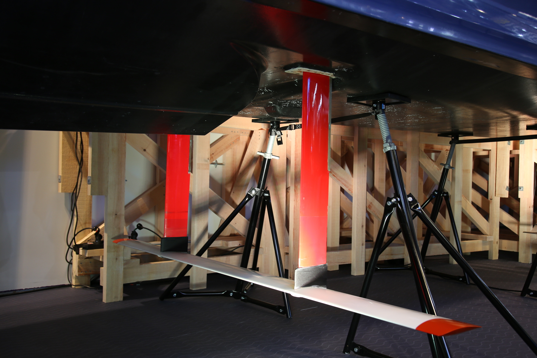 The boat has 2 foils, a larger inverted π-foil near the center of gravity and a smaller T-foil in the stern, combined with the engine and propeller.