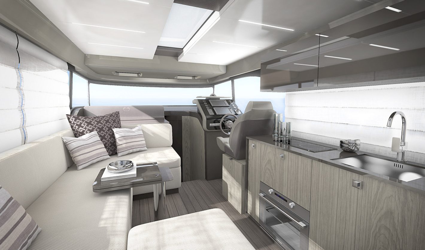 The covered cockpit area on the main deck is sheltered by a windscreen. Thanks to its sliding door and air- conditioning, it will never be too hot, or too cold. It will be nothing but a perfect day for sailing.