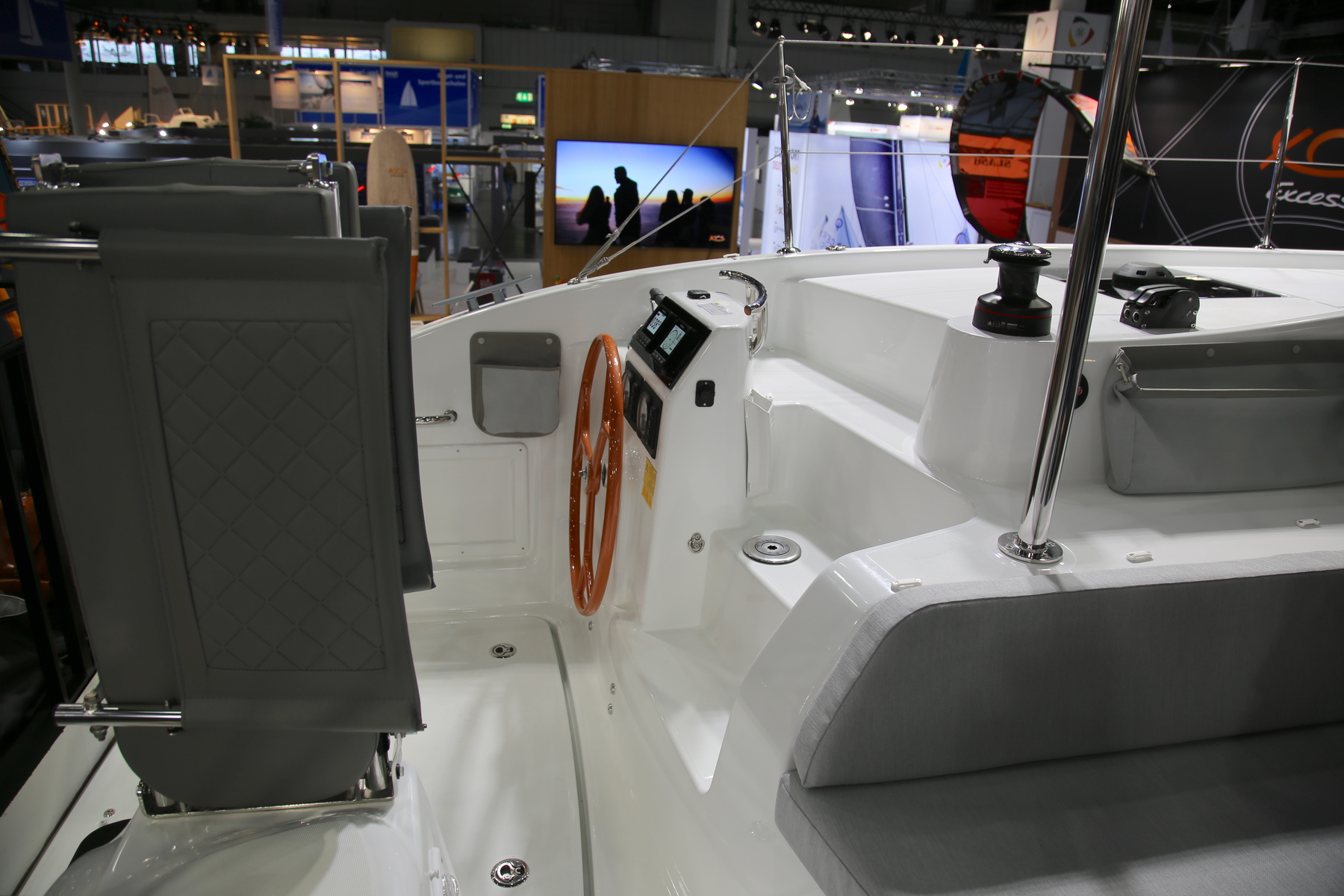 The boat is built in Polyester, vacuum infused with balsa as spacer material, but with solid laminate below the waterline.