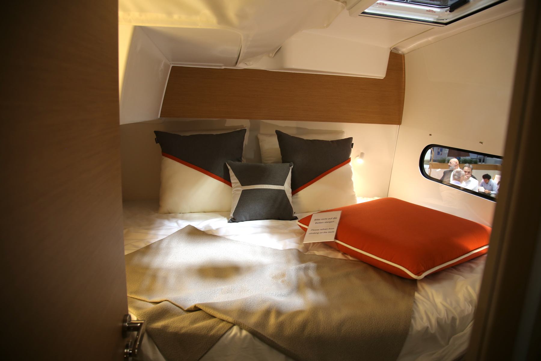 The boat is available with 3 or 4 cabins, the one we are looking at has 3 cabins, which gives a spacious ownercabin in one hull. The beds are wide and spacious, even the one in the front. The hull is narrow in the waterline but then falls out to a larger width and this gives a good volume even in the front cabins