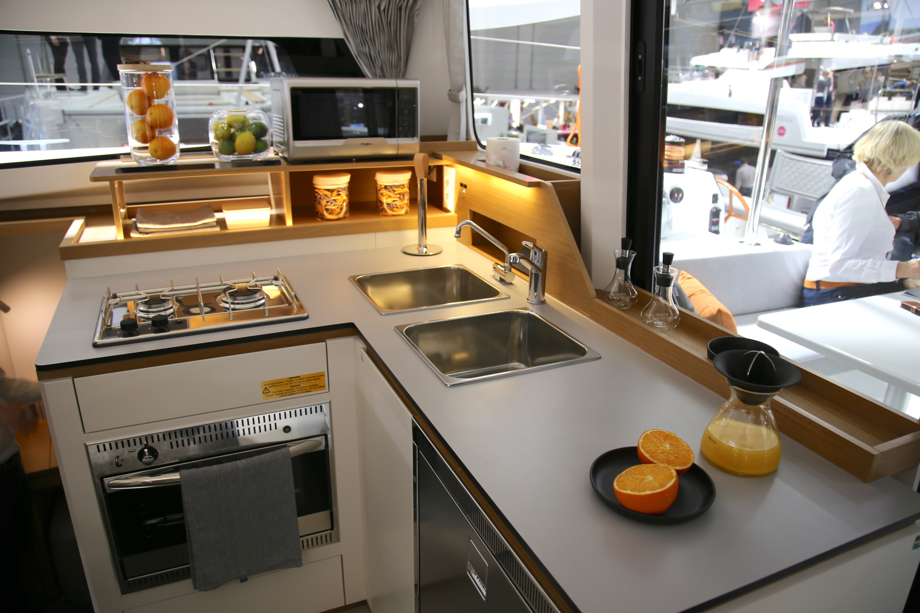The lounge is light and airy with a dining table with L-sofa and a bench, a small navigation table, pentry and storage. The sliding door can also be opened in front of the kitchen area to create a barbench out towards the cockpit.